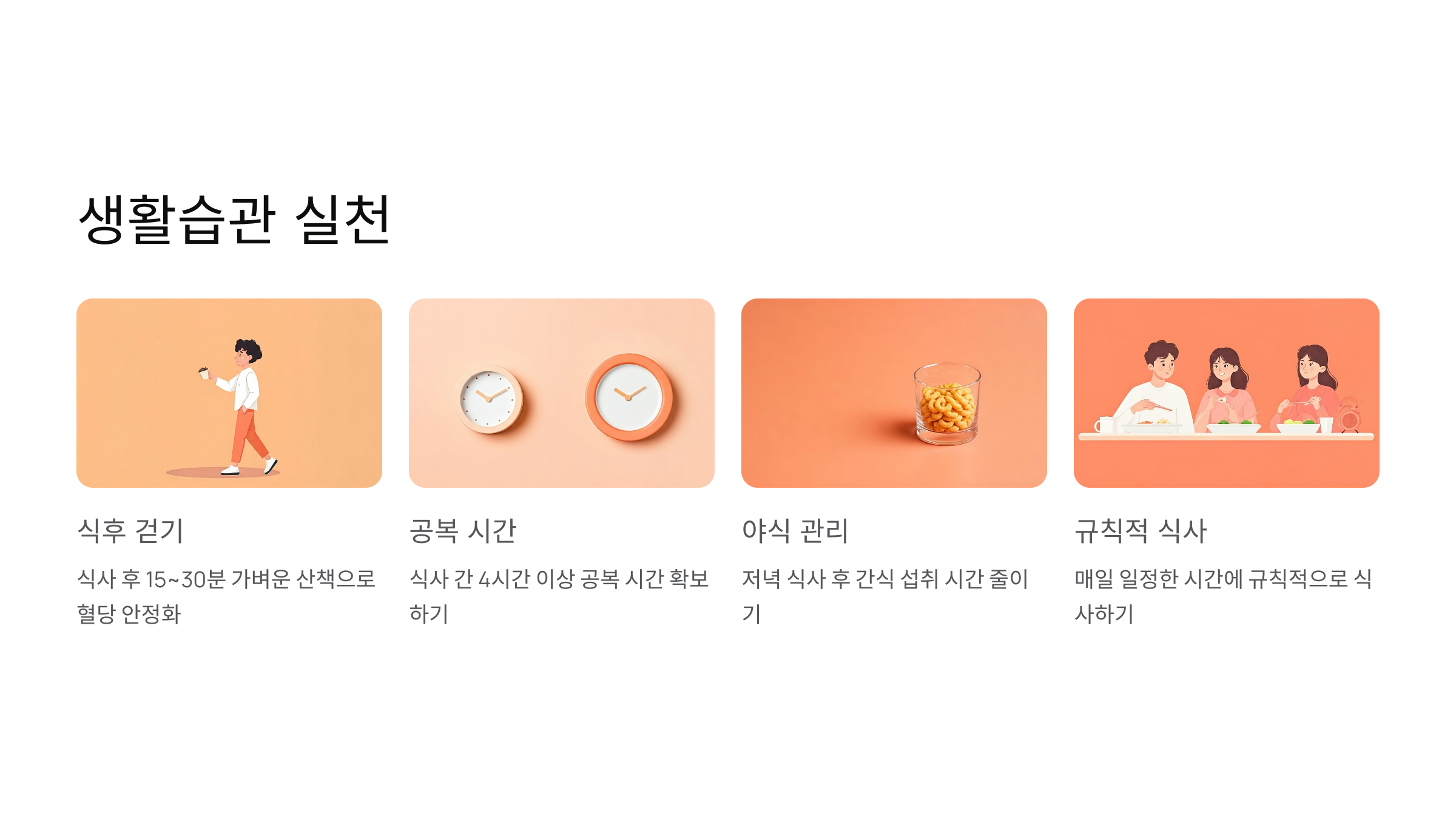 - 야식·간식 시간 줄이기: 불규칙한 혈당 변동 방지