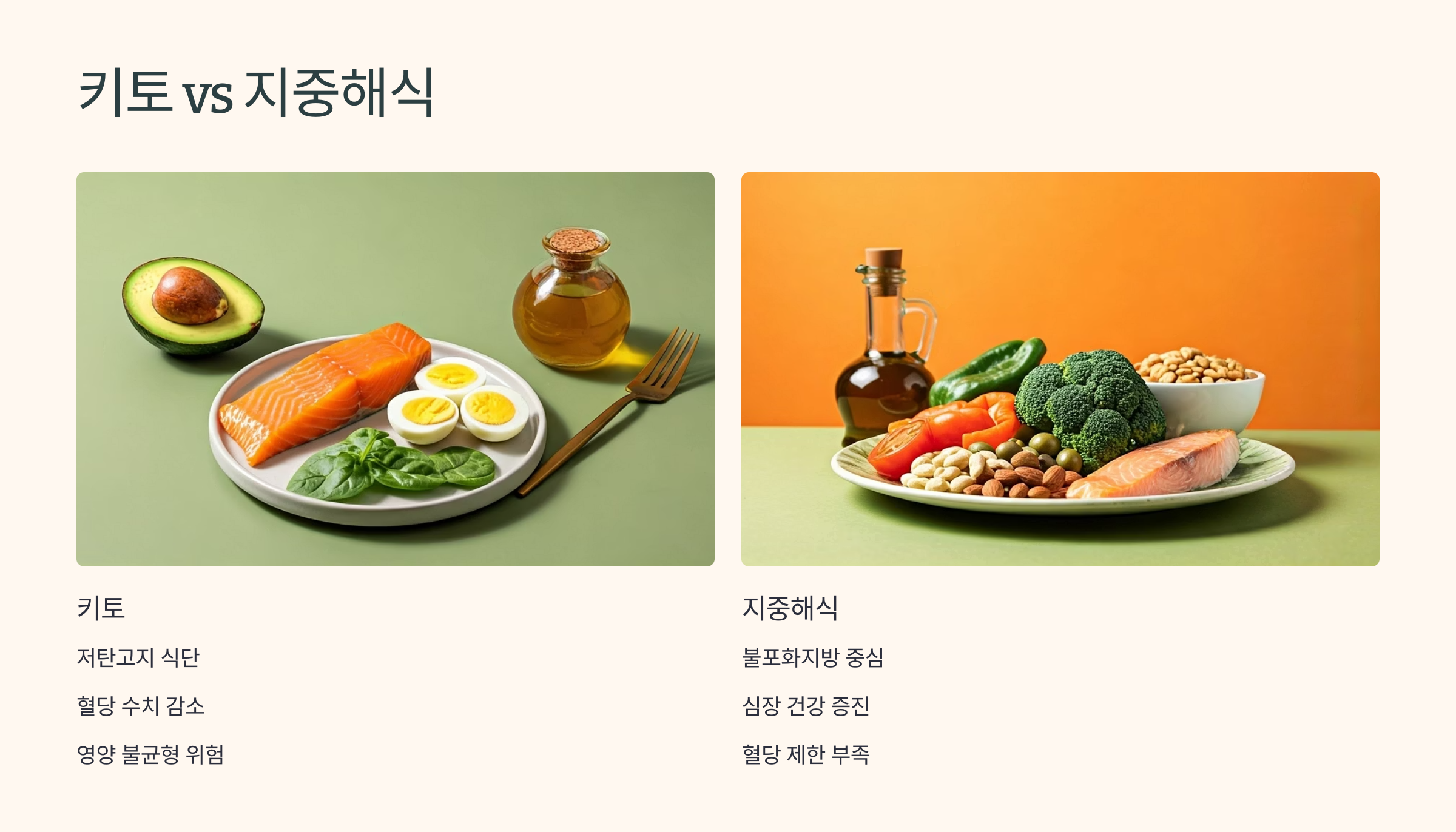 | 장점 | 혈당 안정, 지방 감량 | 심혈관 보호, 식사 다양성 |