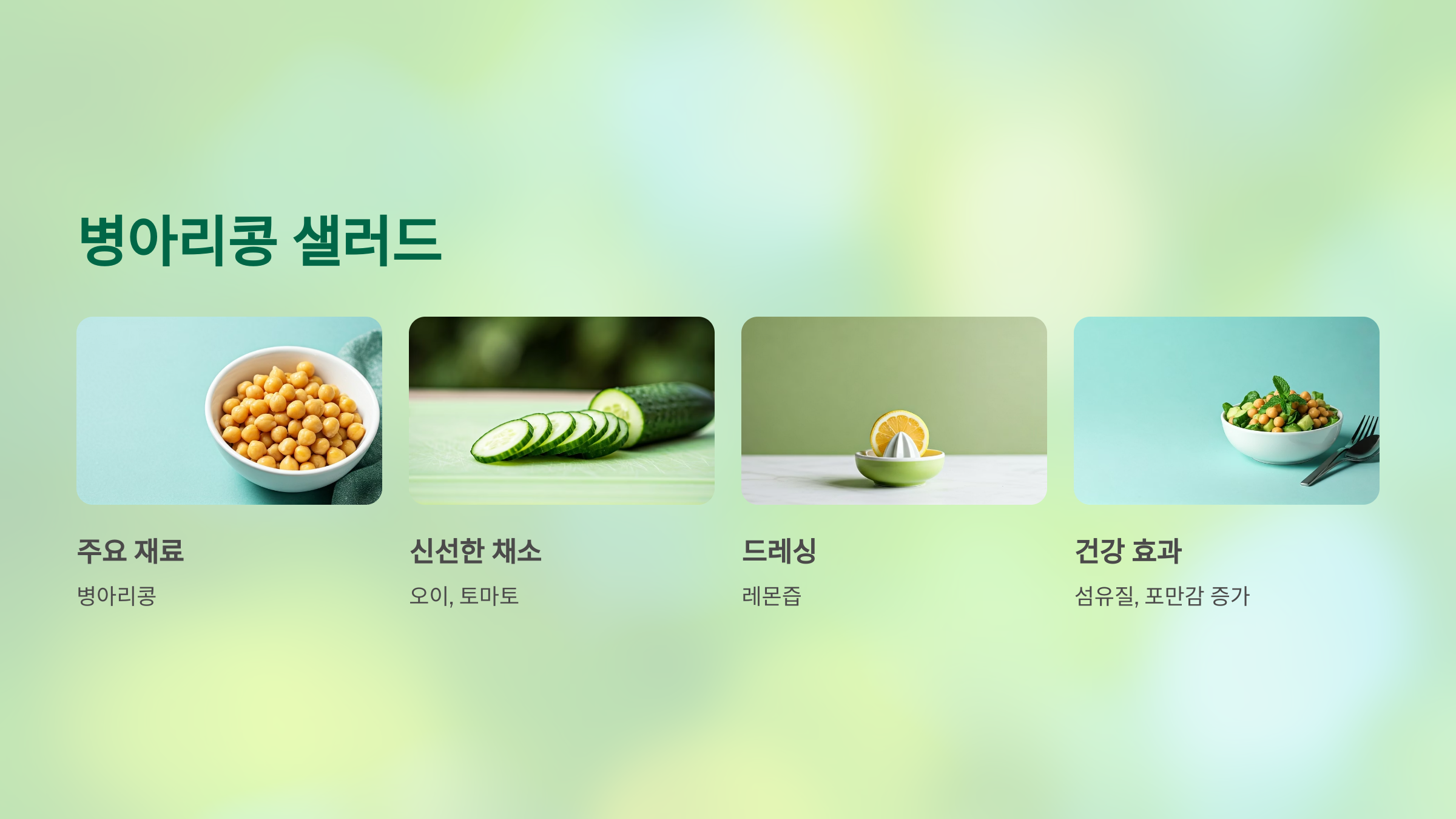 - 재료: 삶은 병아리콩 1/2컵, 오이·방울토마토·양파 약간씩, 레몬즙, 올리브유