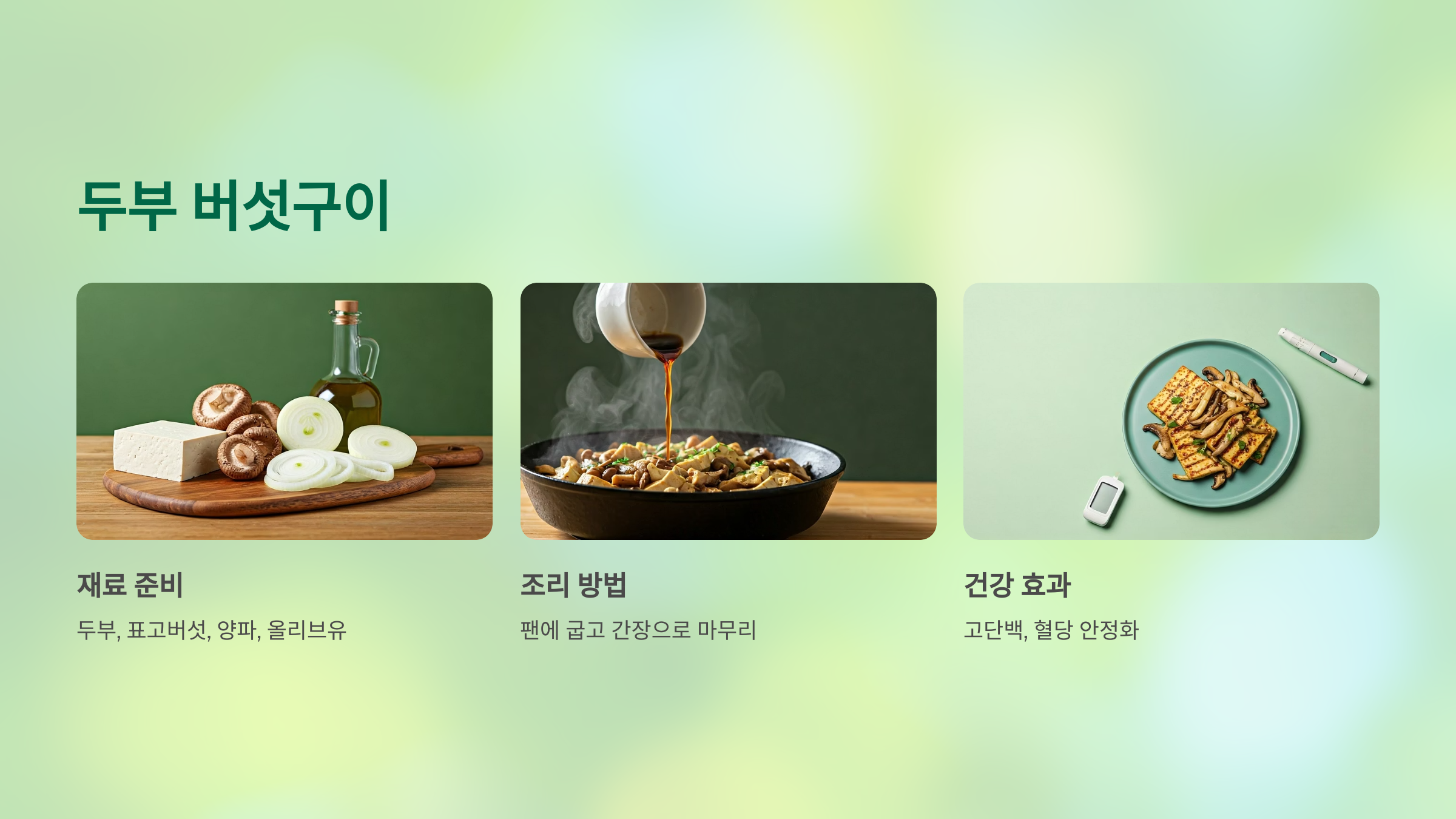 - 재료: 두부 1/2모, 표고버섯 3장, 양파 1/4개, 올리브유 1큰술