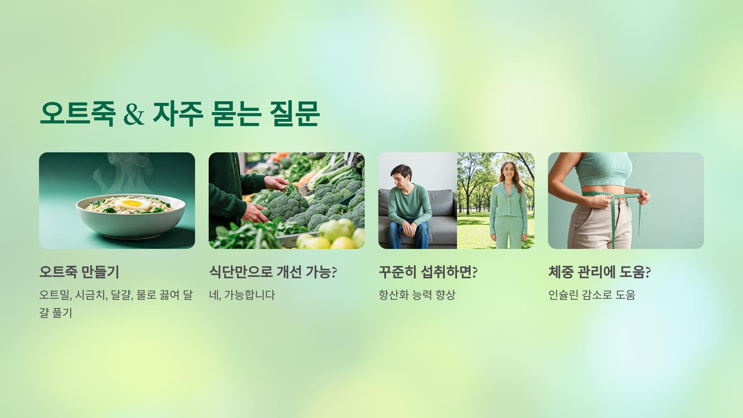 - 조리법: 오트밀을 끓이다가 시금치와 달걀을 넣고 저어가며 익힘