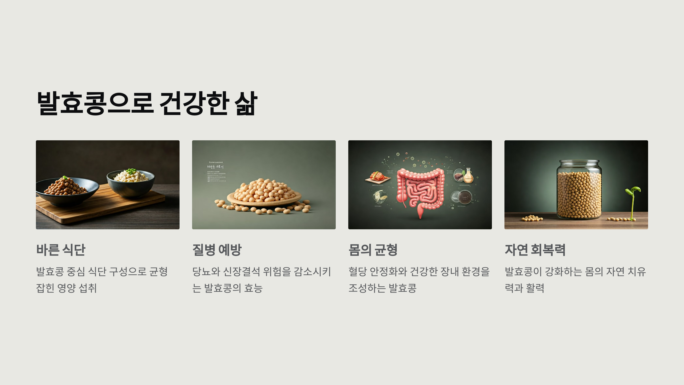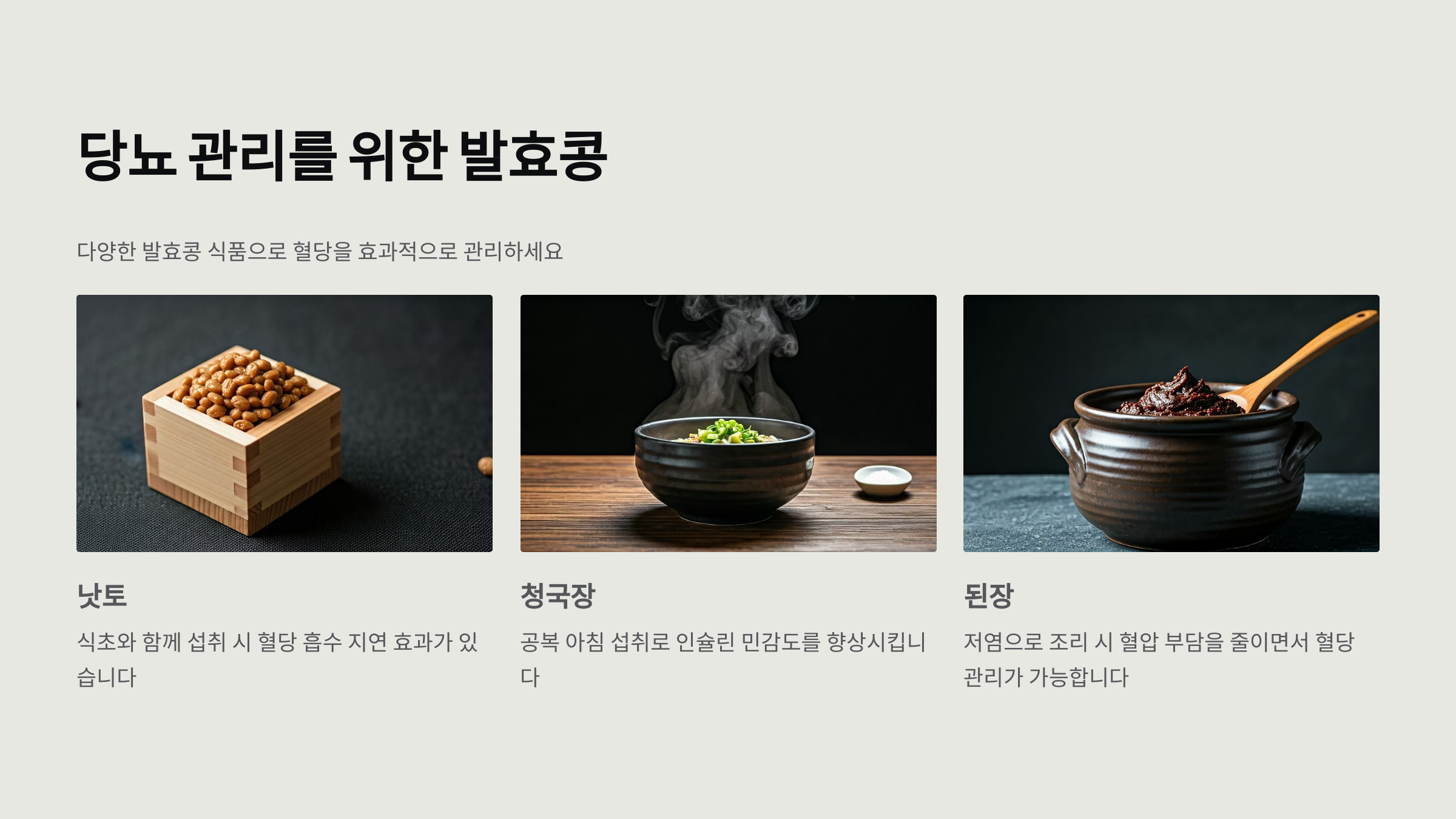 발효콩은 매 끼니에 조금씩 활용하면 부담 없이 섭취할 수 있어요. 혈당이 급상승하지 않도록 저당, 저염 식단을 병행하면 몸의 밸런스가 점점 회복됩니다.
