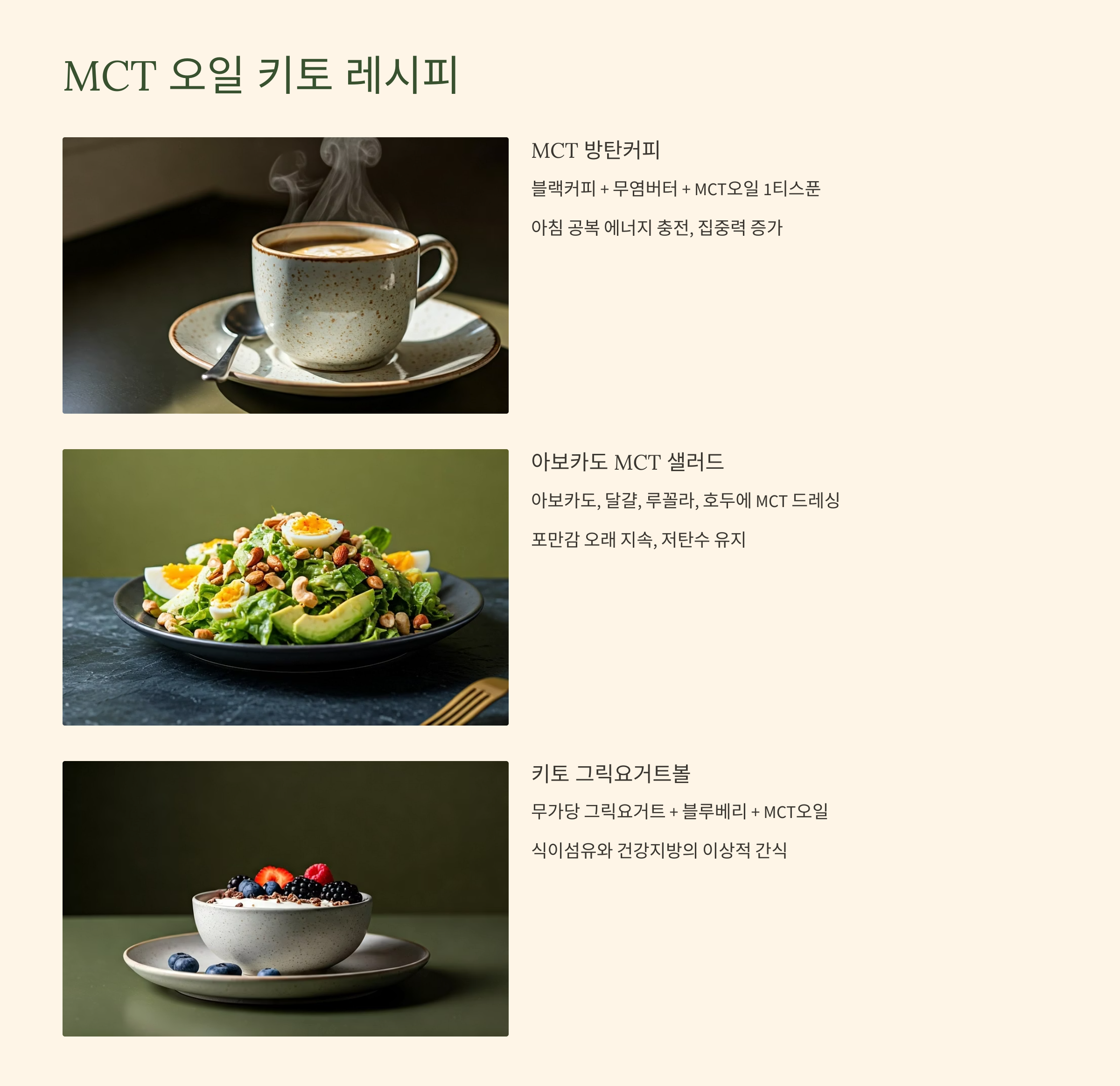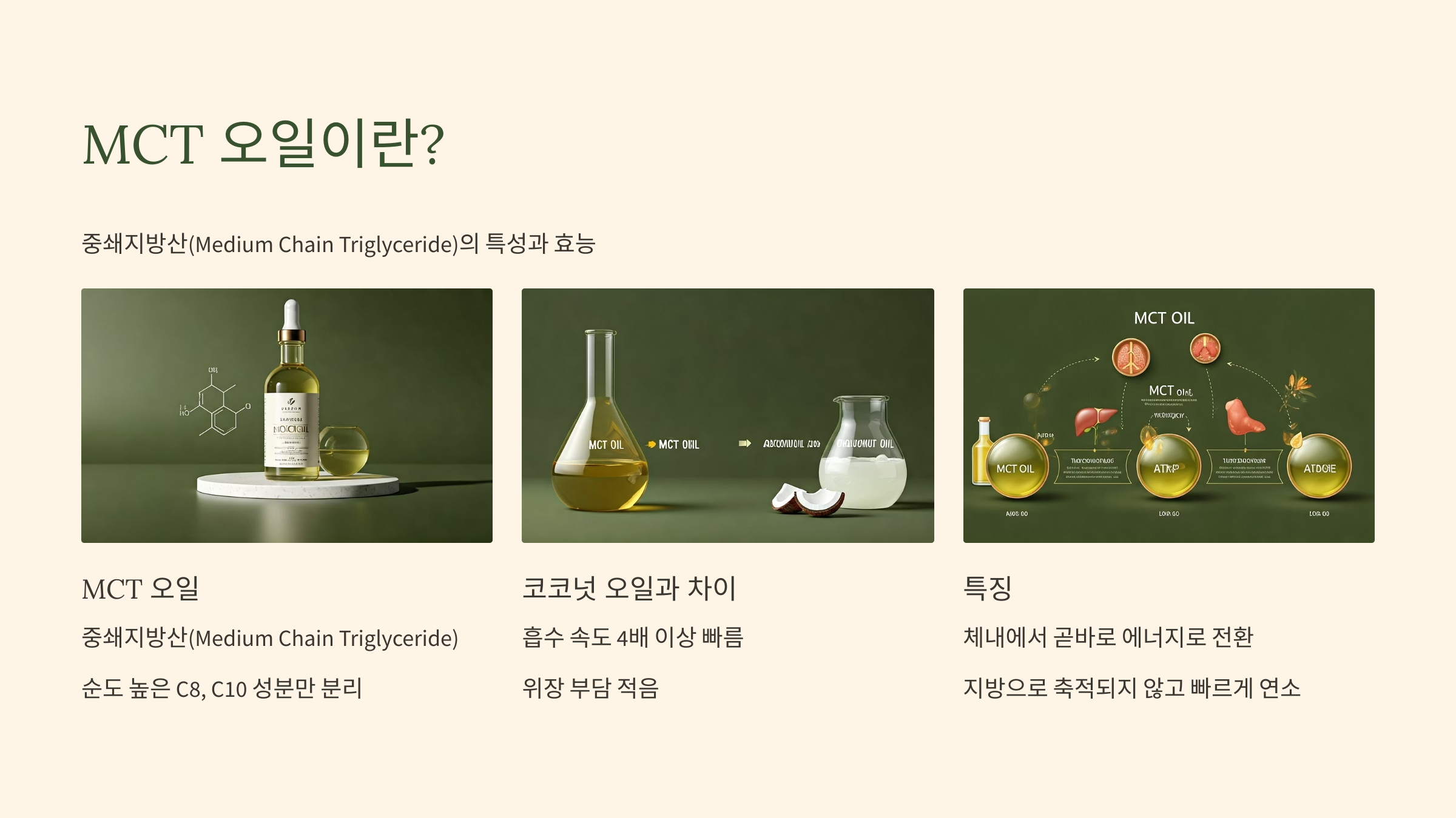 안녕하세요. 저탄고지 식단, 키토제닉 다이어트에 입문하면서 ‘MCT오일’이라는 단어를 처음 들어보신 분들도 많으시죠? 저 역시 처음엔 그냥 코코넛오일 비슷한 거겠지 생각했는데, 지금은 하루도 빼놓지 않고 챙기는 필수템이 되었답니다. 빠른 에너지 공급, 식욕 조절, 체중 감량 등 MCT오일이 주는 효과는 기대 이상이었어요. 하지만 제대로 사용하는 법을 모르면 오히려 속이 불편하거나 체지방으로 전환될 수도 있죠. 이번 글에선 MCT오일이 무엇인지, 어떻게 먹어야 제대로 효과를 보는지, 실제 키토 식단에 어떻게 활용하면 좋은지 하나하나 자세히 알려드릴게요!