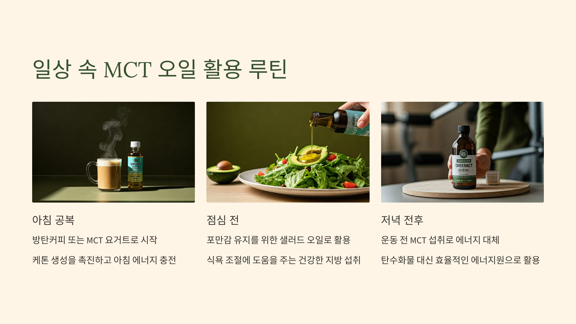 ‘꾸준히, 적당히, 냉용’이 MCT오일 사용의 핵심입니다. 갑자기 많은 양을 먹기보다는 루틴화하는 것이 중요하죠.