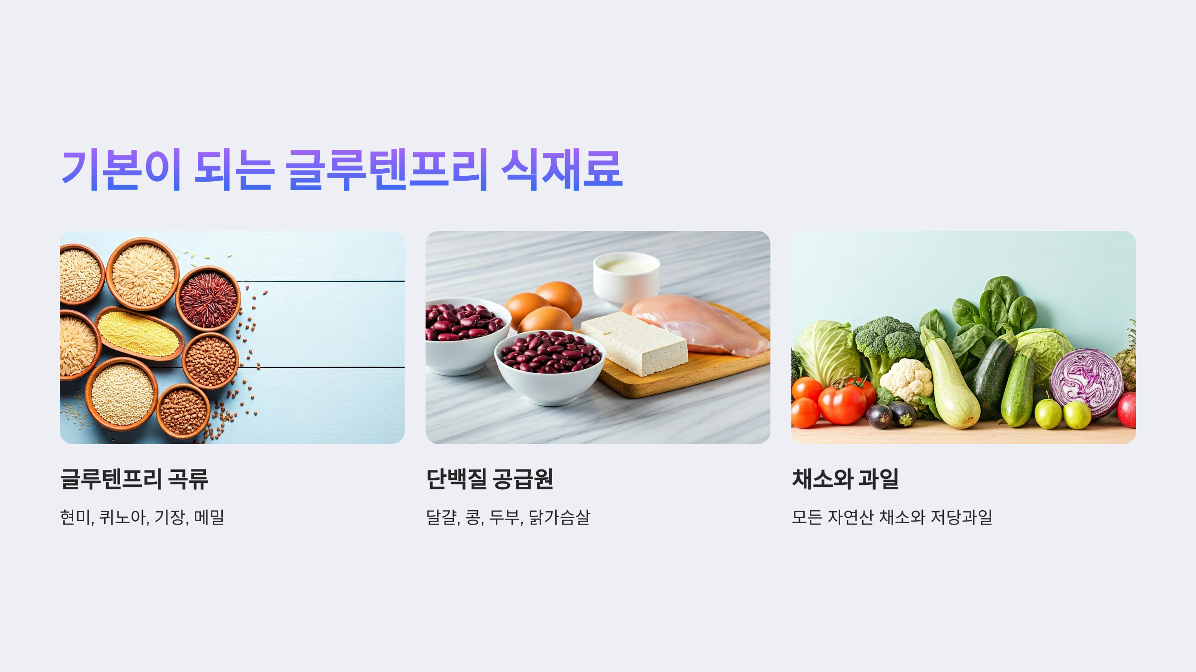 글루텐프리는 ‘없는 것’만 따지는 식단이 아닙니다. 대체 가능한 건강한 식재료가 매우 많으며, 이 식재료들로도 충분히 맛있고 균형 잡힌 식단을 구성할 수 있습니다.