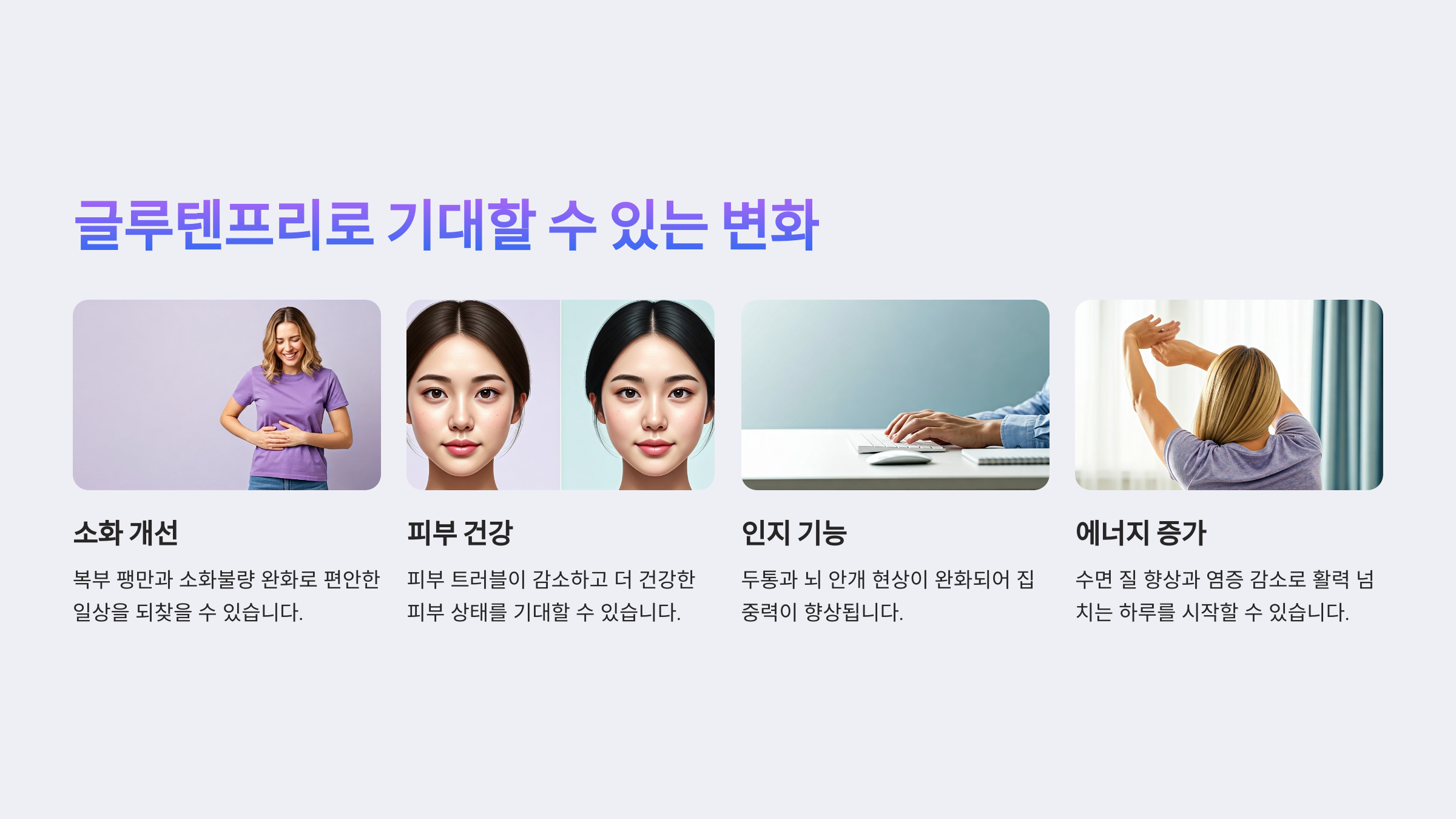모든 사람에게 극적인 변화가 나타나진 않지만, 글루텐프리를 시도한 많은 분들이 위와 같은 긍정적인 체감 효과를 보고 있습니다.