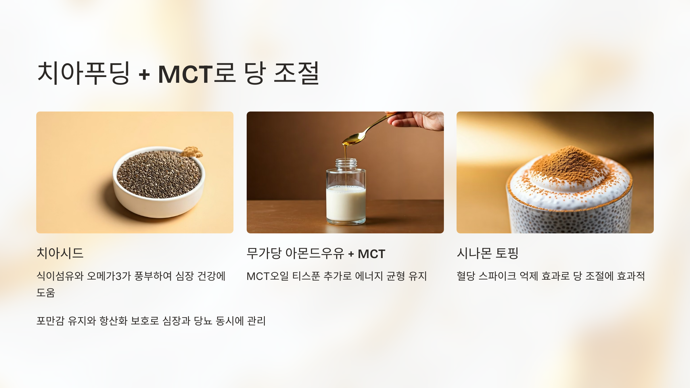 - 치아시드: 식이섬유 + 오메가3 풍부 → 당 흡수 속도 저하
