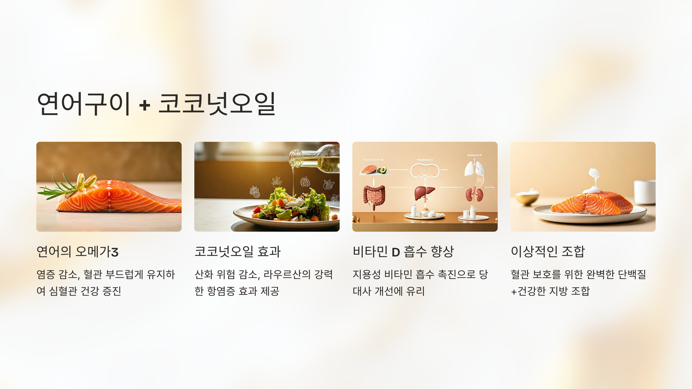 조리 시 코코넛오일을 사용하면 산패 없이 안정적인 조리가 가능하며 혈관 보호를 위한 이상적인 단백질+지방 조합이 완성됩니다.