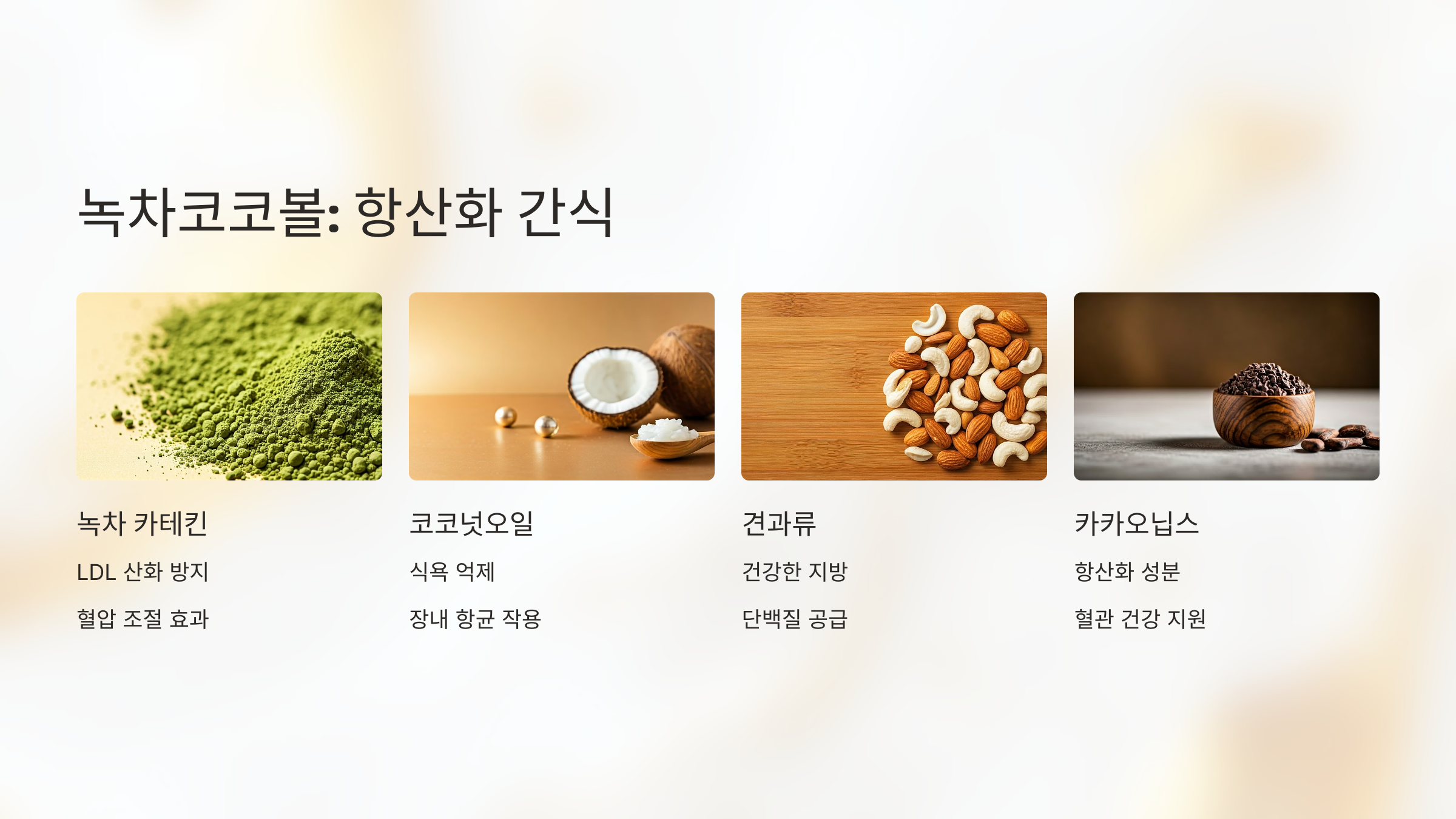 - 녹차의 카테킨 → LDL 산화 방지, 혈압 조절