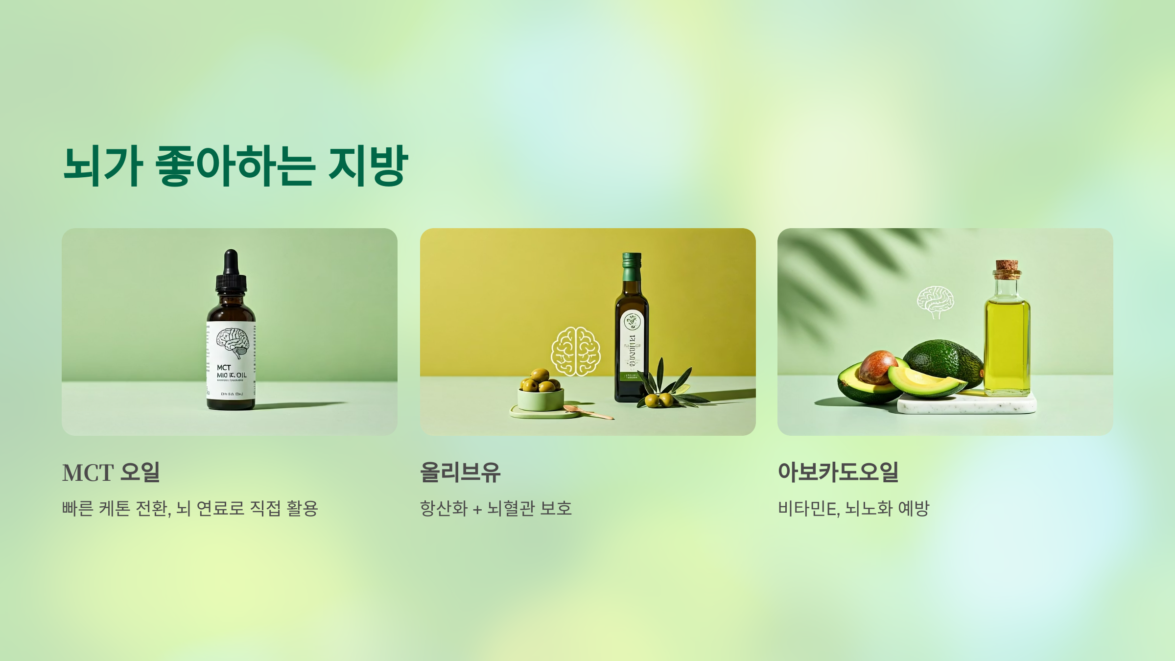 | MCT오일 | 빠른 케톤 전환 → 뇌 연료로 직접 활용 | 아침 공복 음료 |