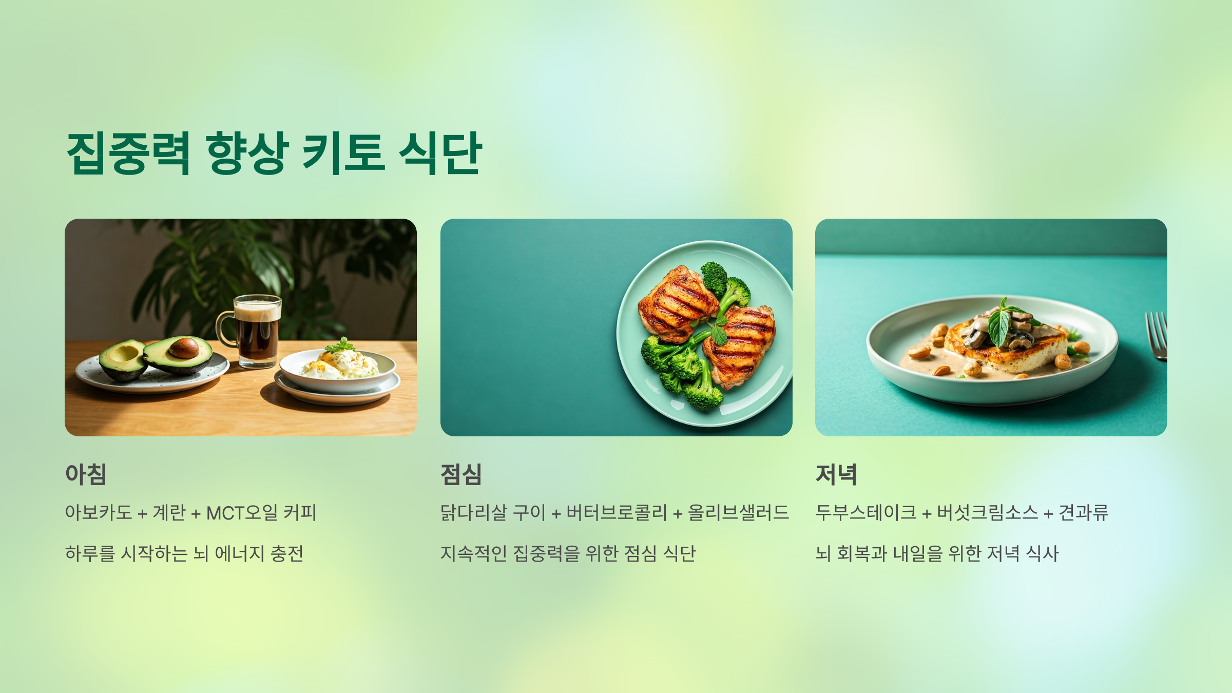 이 식단은 저탄수화물-고지방-중단백 조합으로 집중력 유지와 인슐린 민감성 개선에 유리하며, 오전부터 뇌가 또렷해지는 변화를 경험할 수 있습니다.