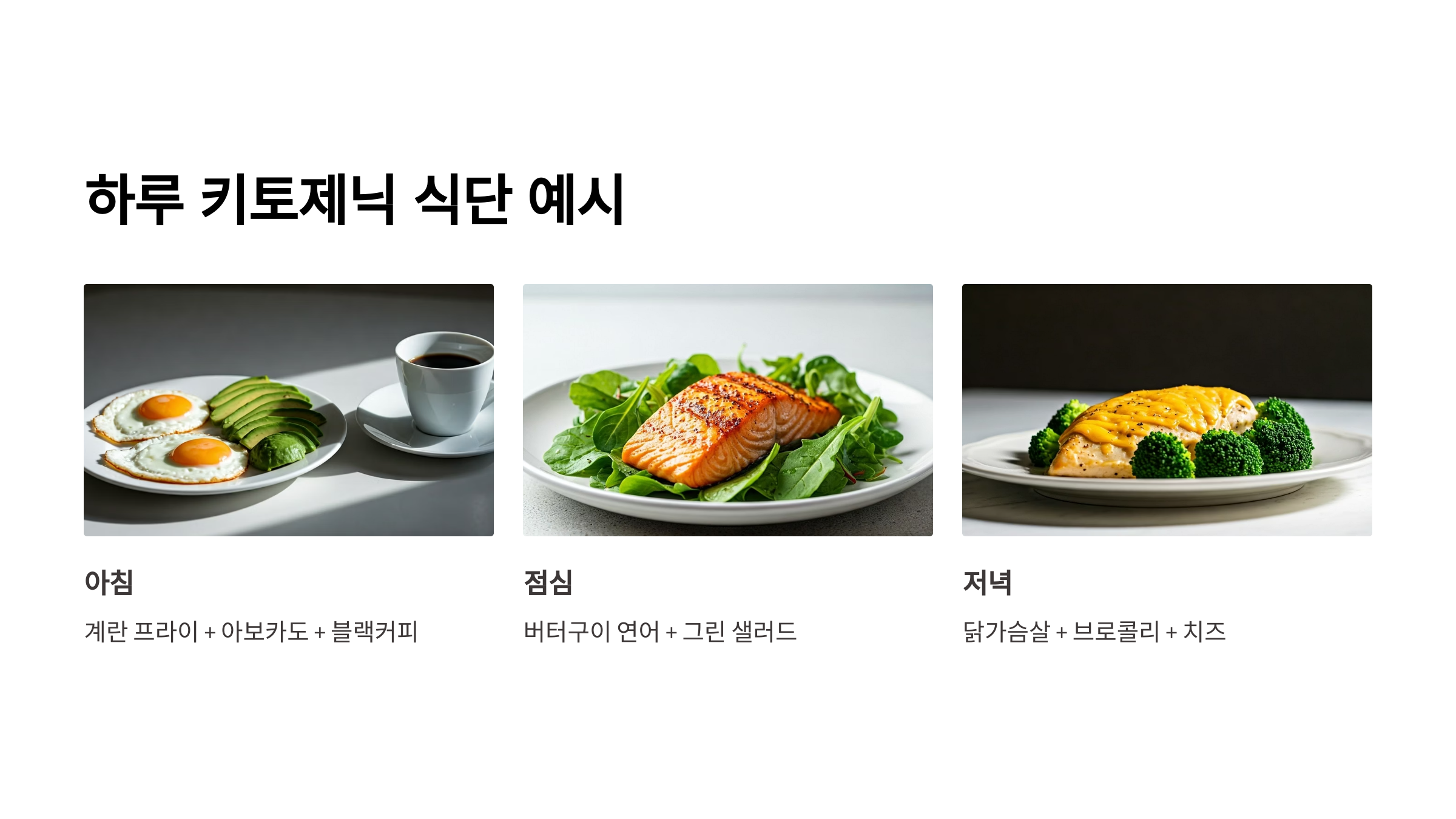 처음 키토제닉 식단을 구성할 때, ‘도대체 뭘 먹지?’ 고민 많이 하셨을 거예요. 아래는 하루를 기준으로 짜본 예시 식단입니다.