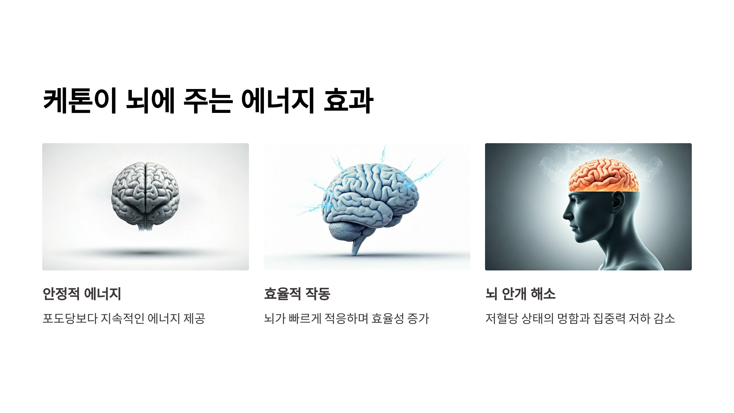 케톤체는 뇌에서 에너지원으로 빠르게 흡수되며, 포도당보다 더 안정적인 에너지 공급이 가능합니다. 이는 집중력과 기억력 향상에 도움을 줍니다.
