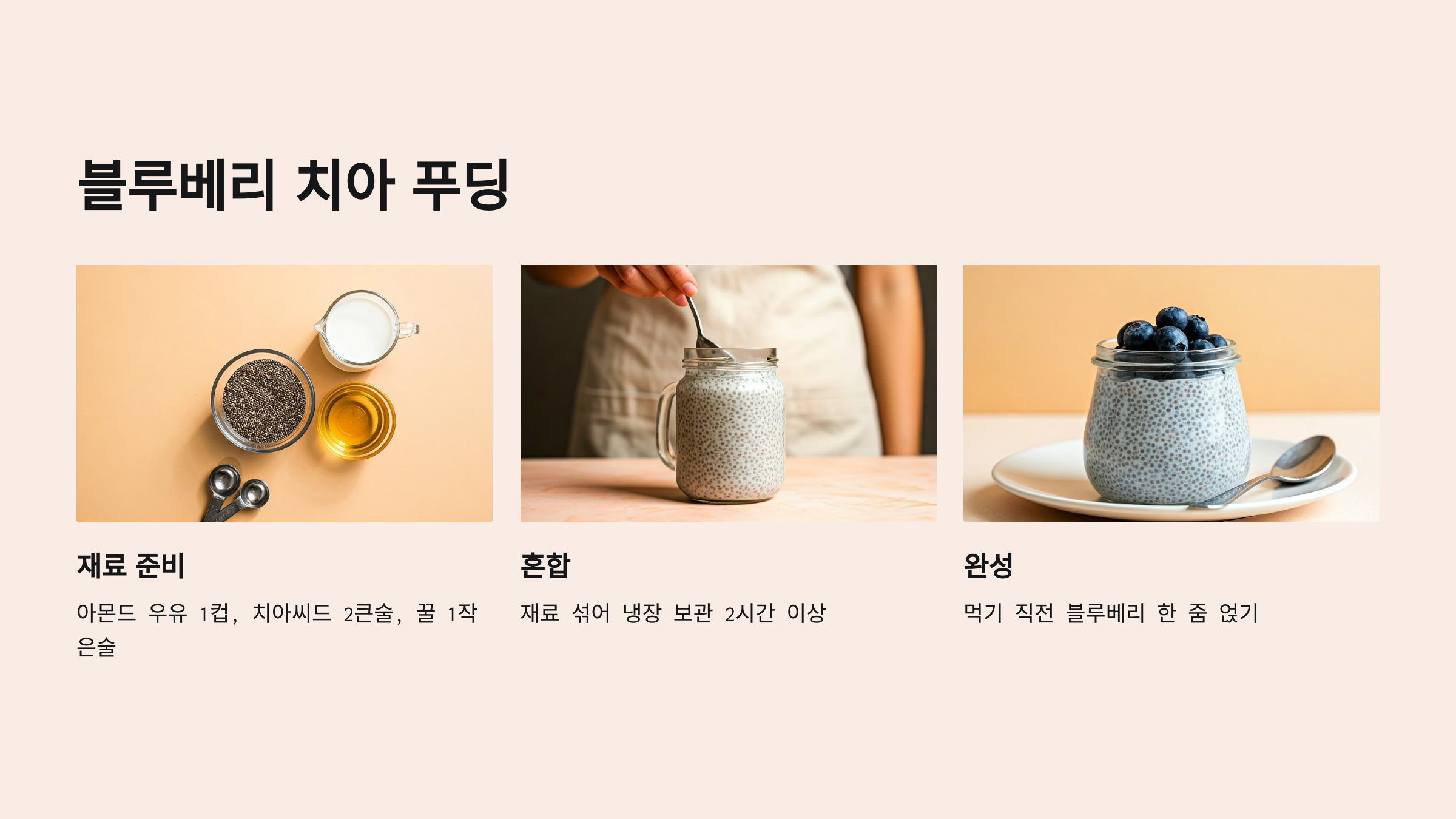 치아씨드는 식이섬유가 풍부하고, 블루베리는 안토시아닌 가득한 항산화 열매! 이 조합으로 만든 푸딩은 아침 공복혈당을 안정시키는 데도 효과적이에요.