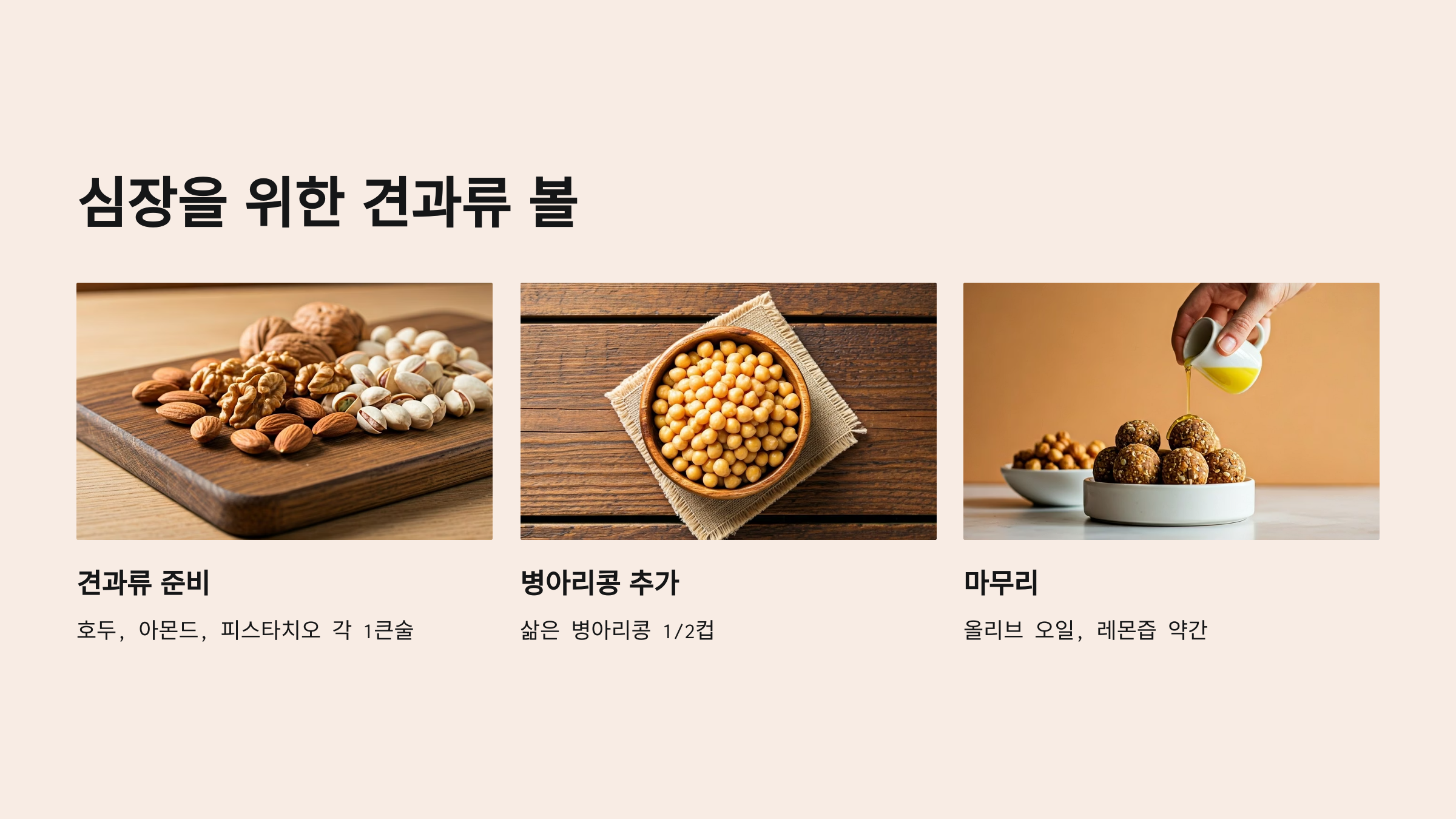 견과류는 불포화지방산과 식물성 단백질, 비타민E가 풍부해 심장과 혈관 건강을 동시에 챙길 수 있어요. 단, 무염·무가당 제품을 사용하는 것이 핵심!