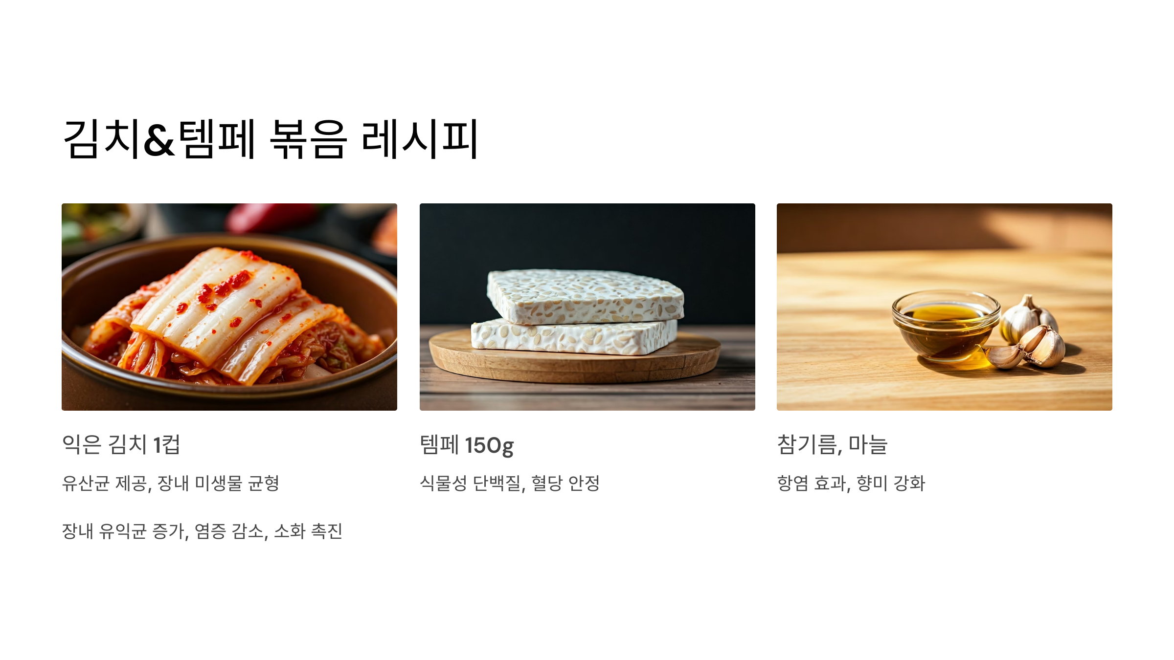 발효식품의 대표주자인 김치와, 식물성 단백질과 유익균의 보고인 템페의 조합! 이 요리는 장내 유익균을 증가시키고, 염증을 낮추며 소화를 촉진해줘요. 특히 템페는 혈당 상승을 억제하는 데도 도움을 준답니다.