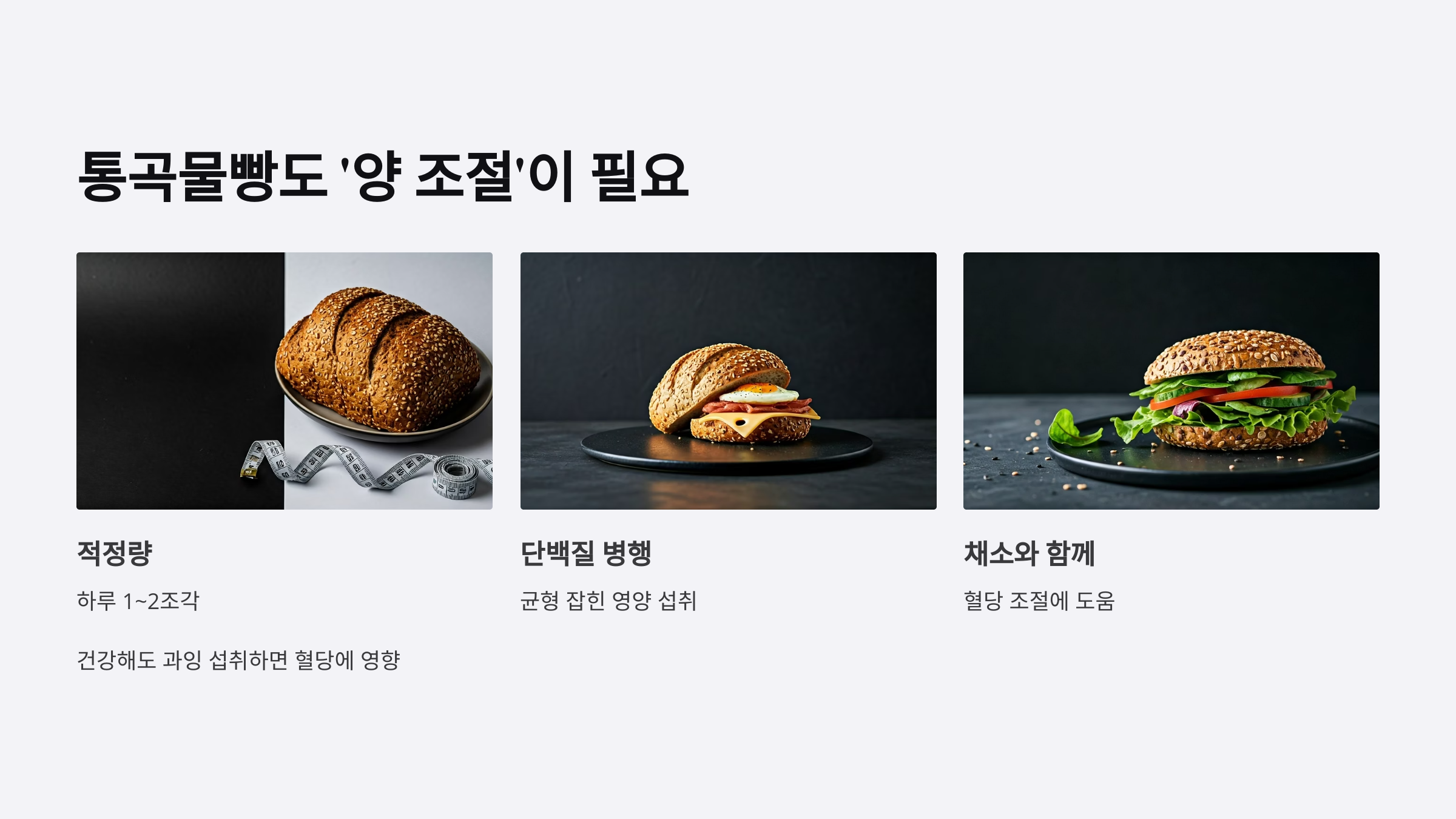 건강하다고 해서 무한정 먹어도 되는 건 아니에요. 통곡물빵도 탄수화물이기 때문에 과잉 섭취하면 혈당에 영향을 줄 수 있어요. 보통 하루 1~2조각이 적당하며, 단백질과 채소와 함께 섭취하는 것이 좋아요.