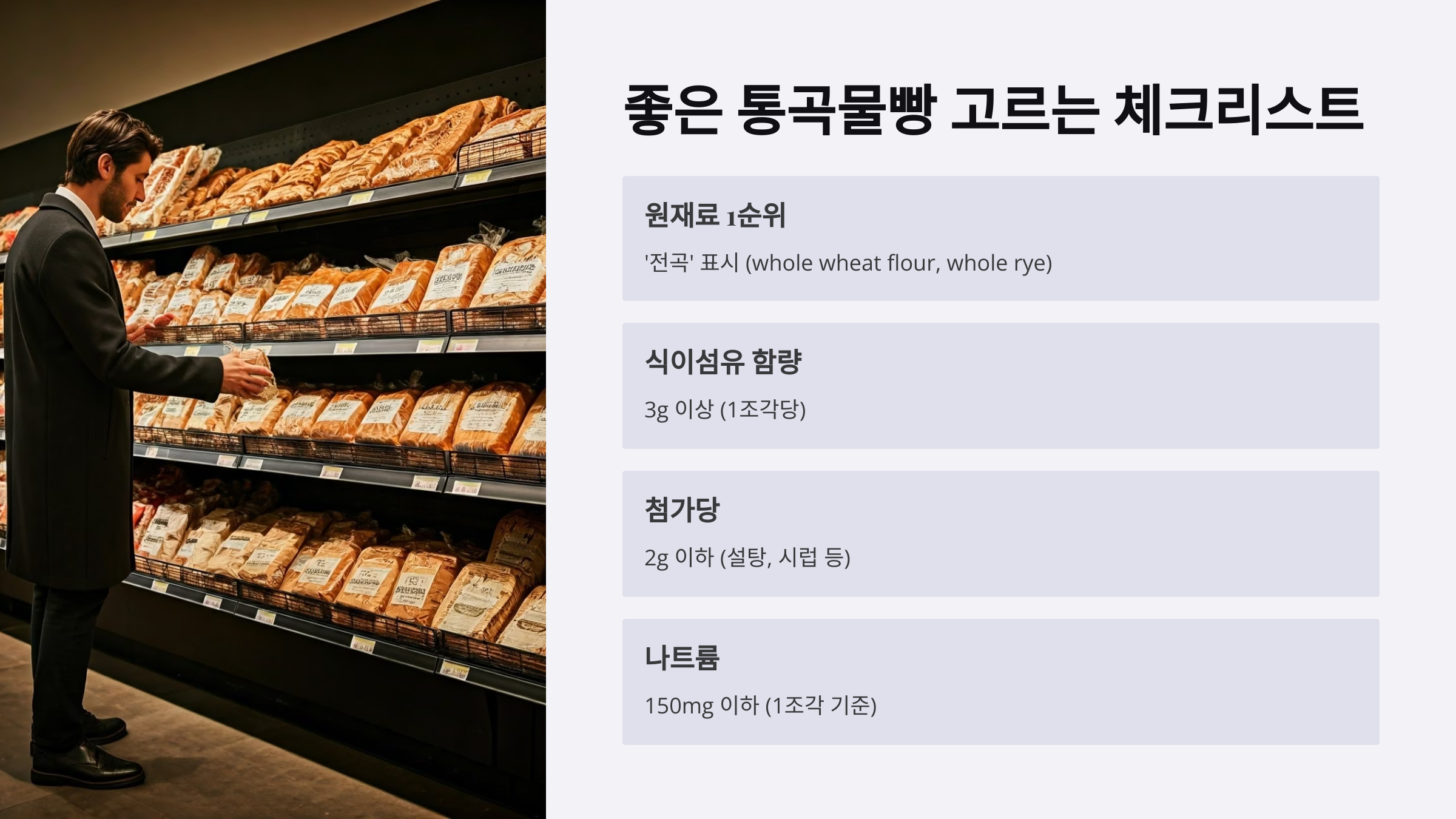 마트나 베이커리에서 건강한 통곡물빵을 고를 때는 아래 기준을 참고하세요. 재료표와 영양정보는 필수 확인입니다!