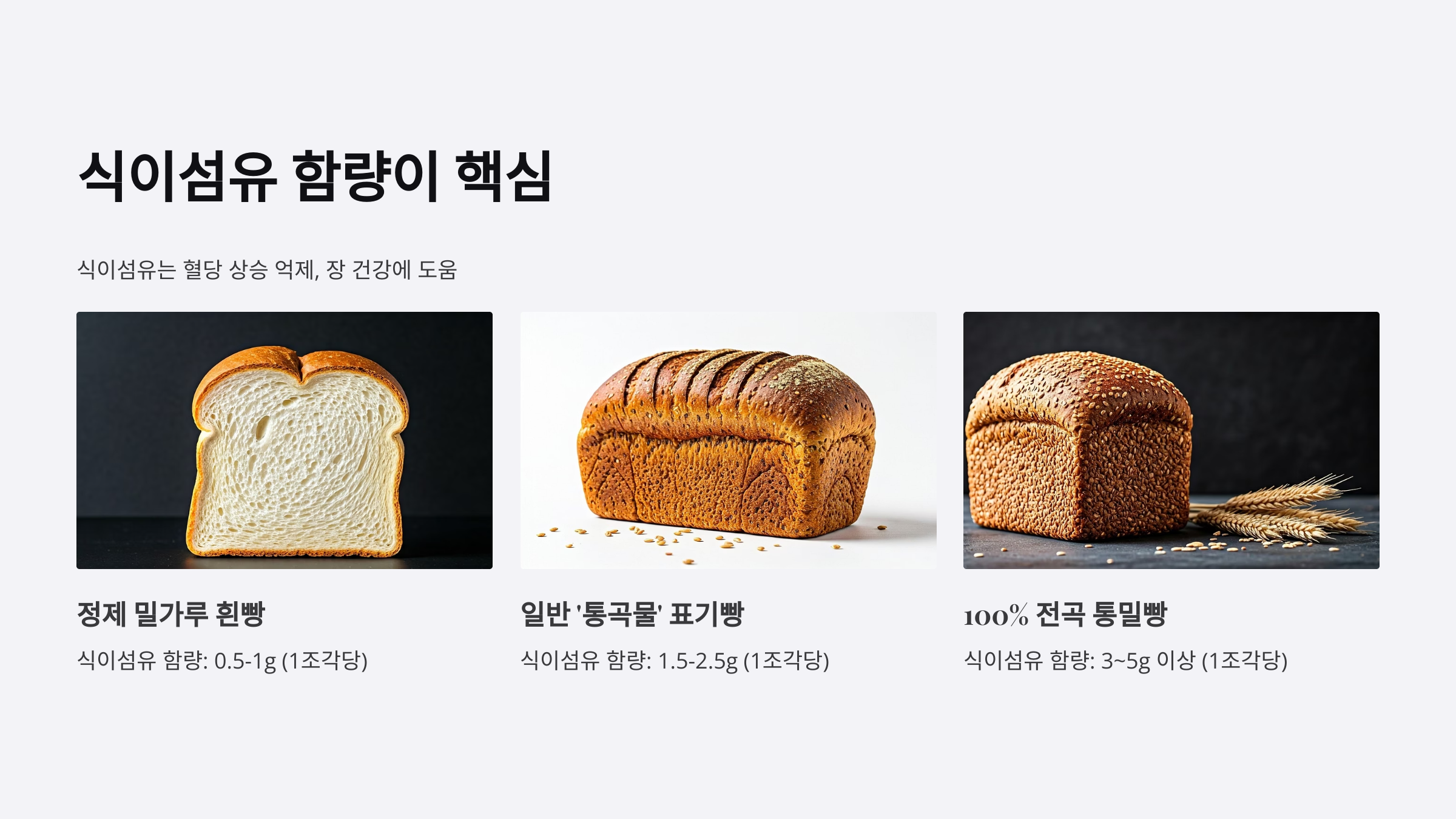 건강한 통곡물빵은 식이섬유가 풍부해야 해요. 식이섬유는 혈당 상승을 억제하고 장 건강에도 도움을 줍니다. 아래 비교를 참고해보세요.