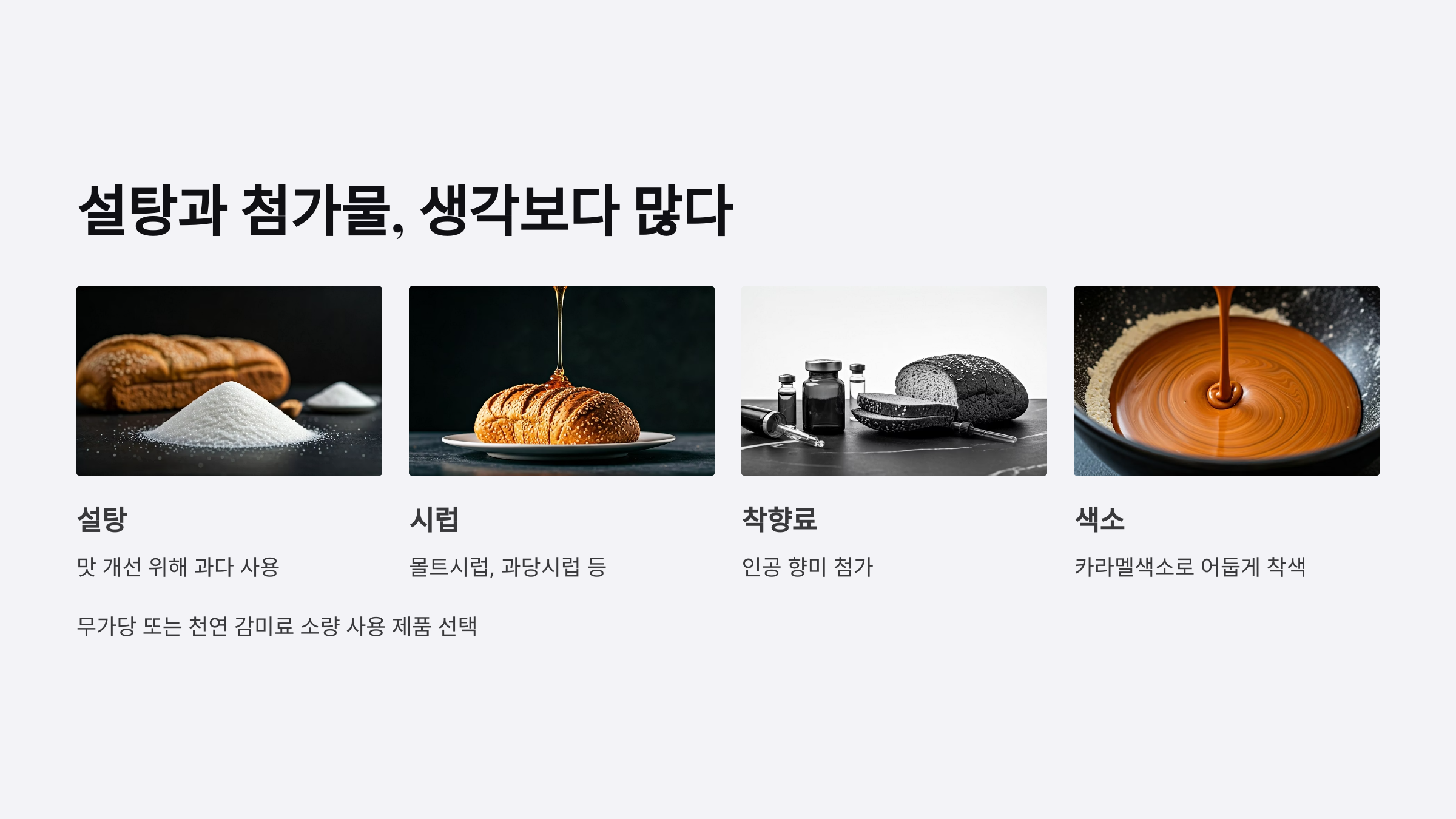 많은 통곡물빵이 맛을 내기 위해 설탕, 시럽, 착향료, 색소 등을 포함합니다. 특히 ‘몰트시럽’이나 ‘카라멜색소’는 색만 어둡게 만들 뿐 영양학적 장점은 없어요. 무가당 또는 천연 감미료 소량 사용 제품을 고르세요.