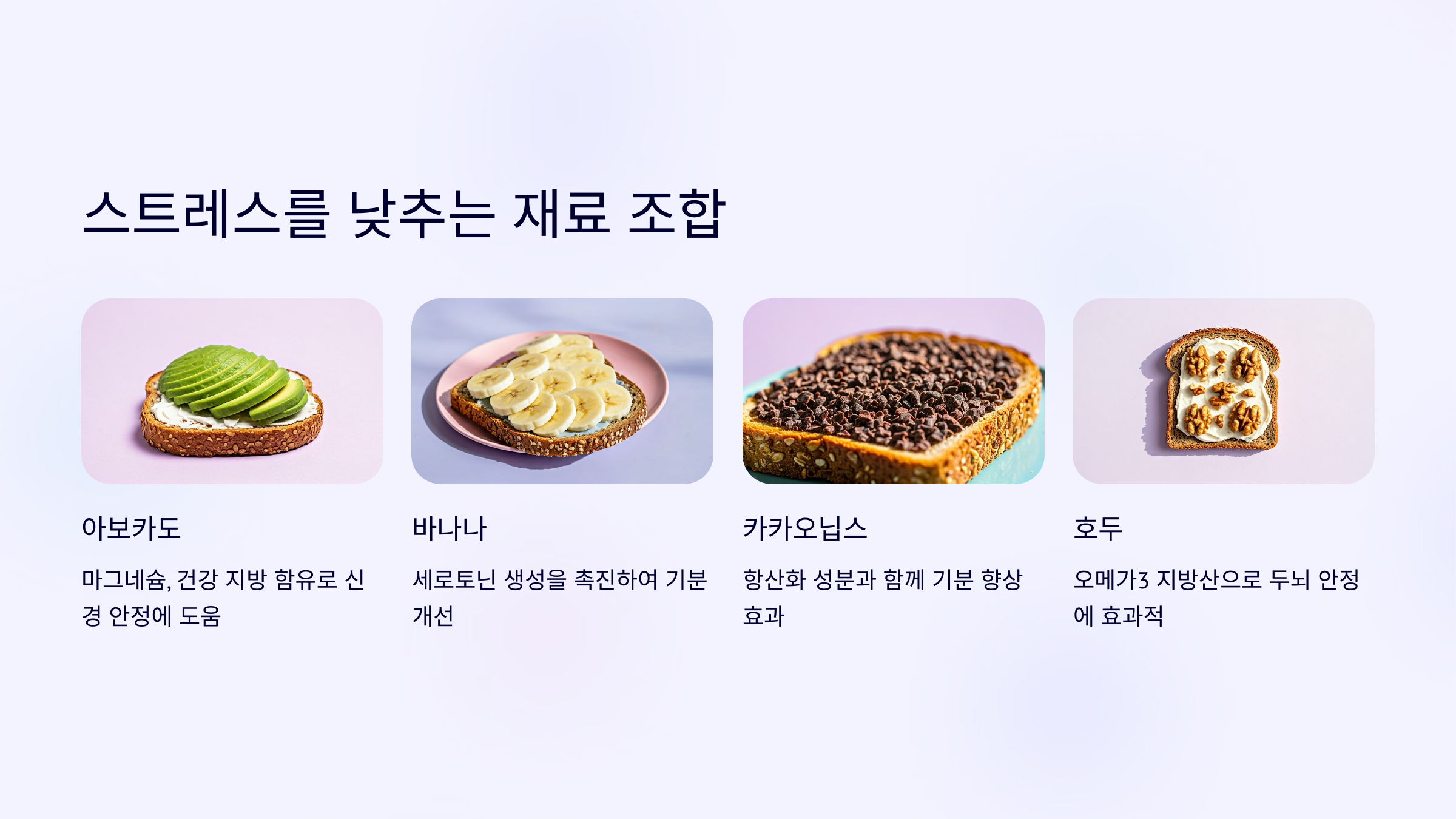 마그네슘이 풍부한 아보카도, 오메가3가 많은 호두, 세로토닌 유도 바나나 등을 곁들이면 스트레스 완화에 효과적이에요.