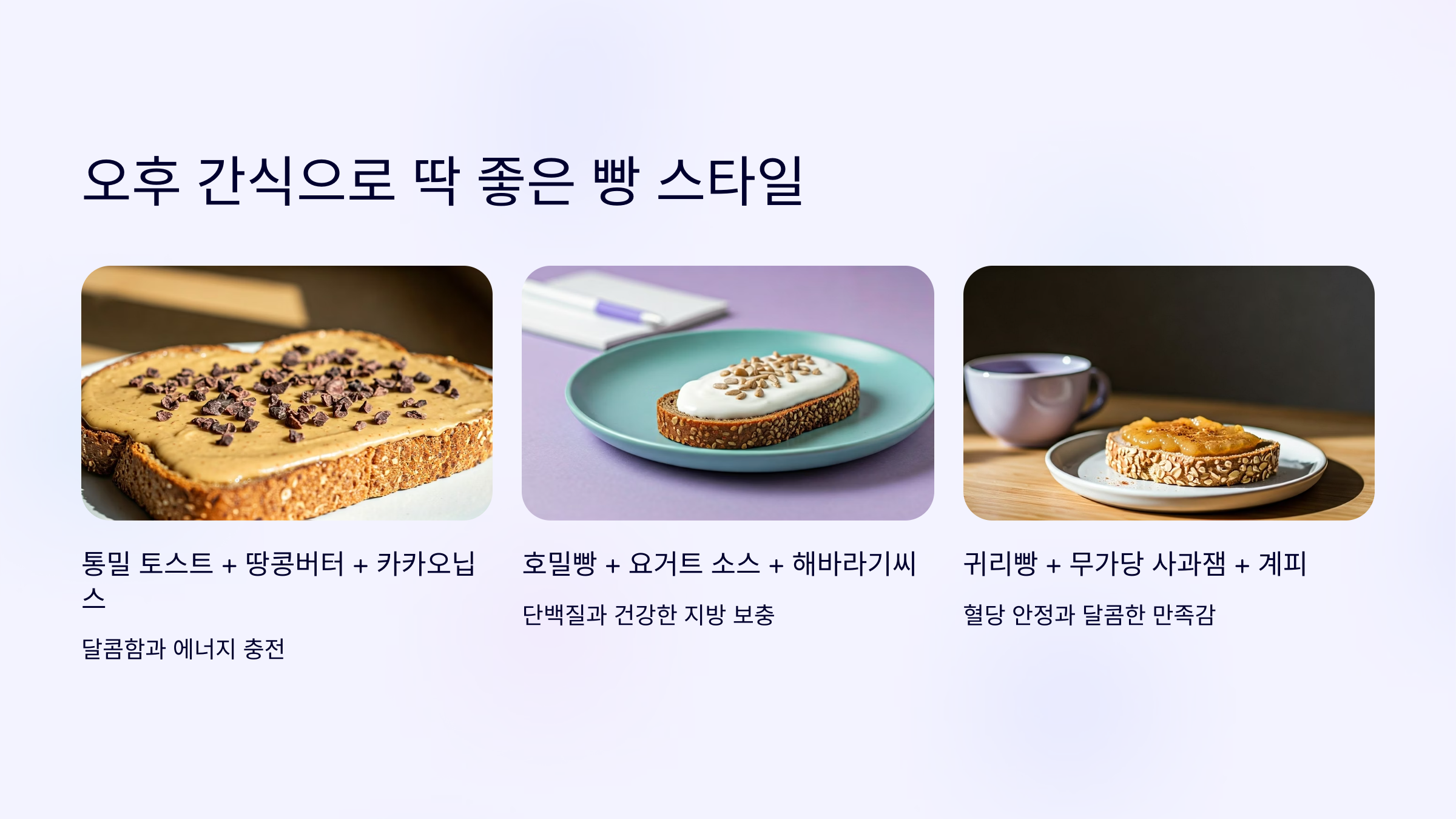 오후 3~4시, 집중력도 떨어지고 입도 심심해질 때, 통곡물빵으로 만든 건강 간식은 좋은 선택입니다.
