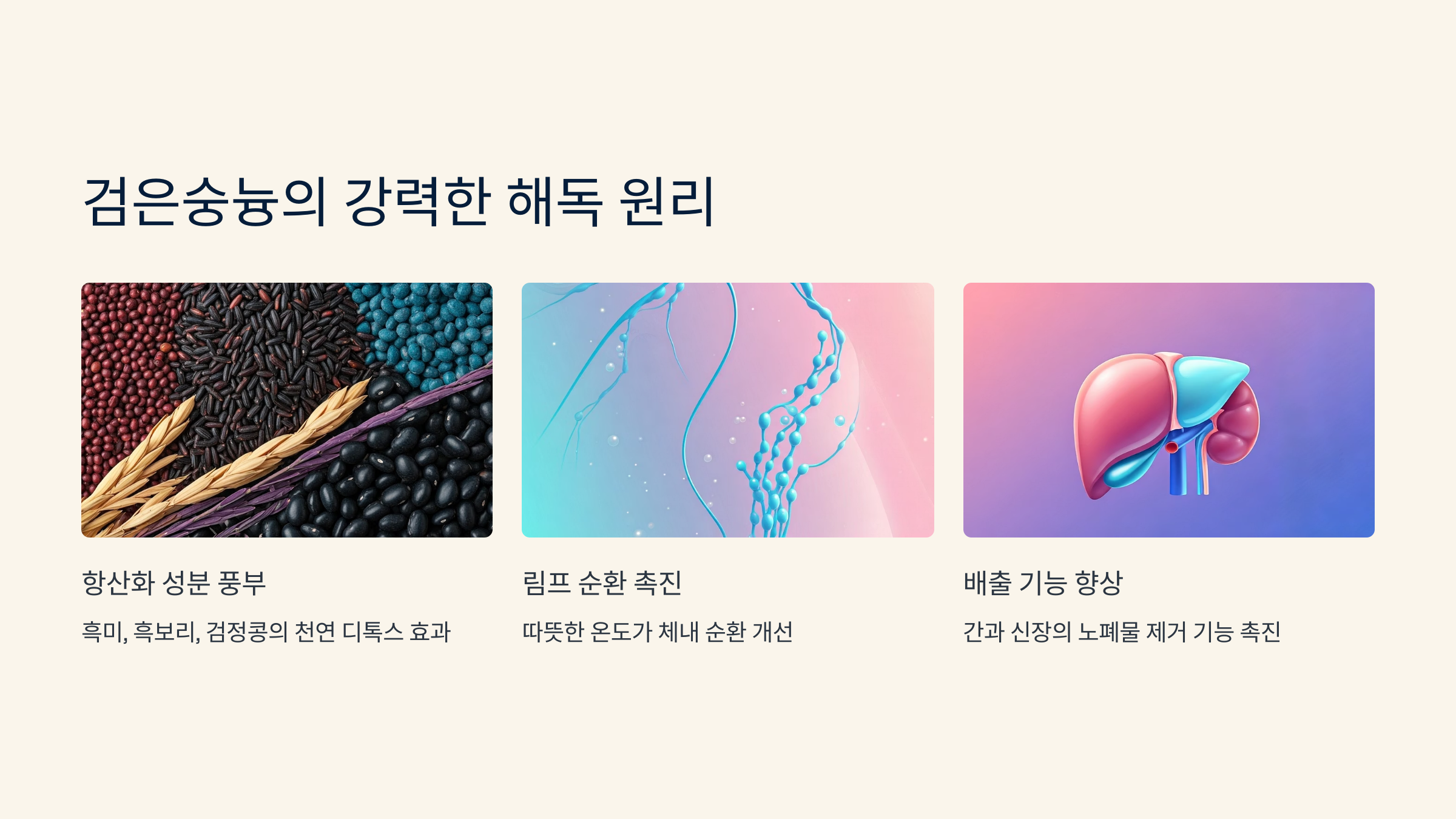 검은숭늉은 흑미, 흑보리, 검정콩 등 천연 디톡스 식품으로 끓여내기 때문에, 항산화 성분이 풍부하고 따뜻한 온도가 림프 순환을 돕습니다. 이 조합은 간과 신장의 배출 기능을 촉진해 체내 노폐물 제거에 탁월하죠.