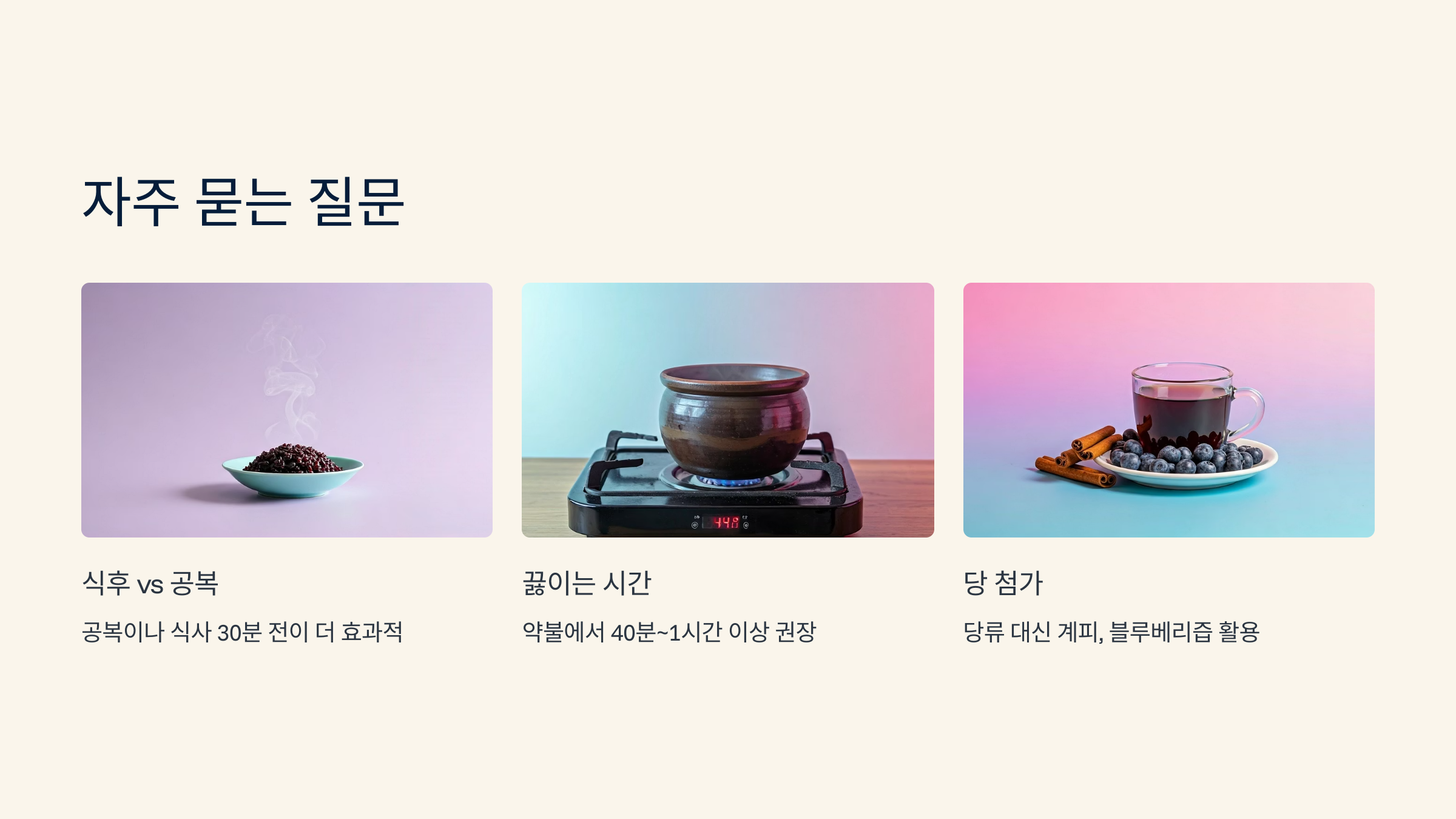 - 흑미+검정콩+보리: 기본 항산화 조합, 공복 추천