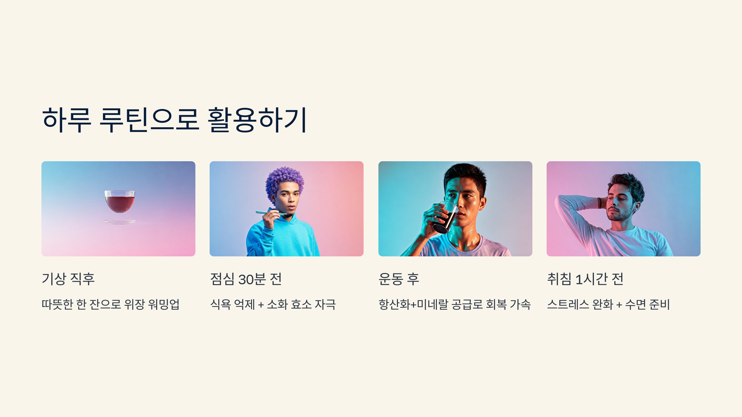 - 운동 후: 항산화+미네랄 공급로 회복 가속