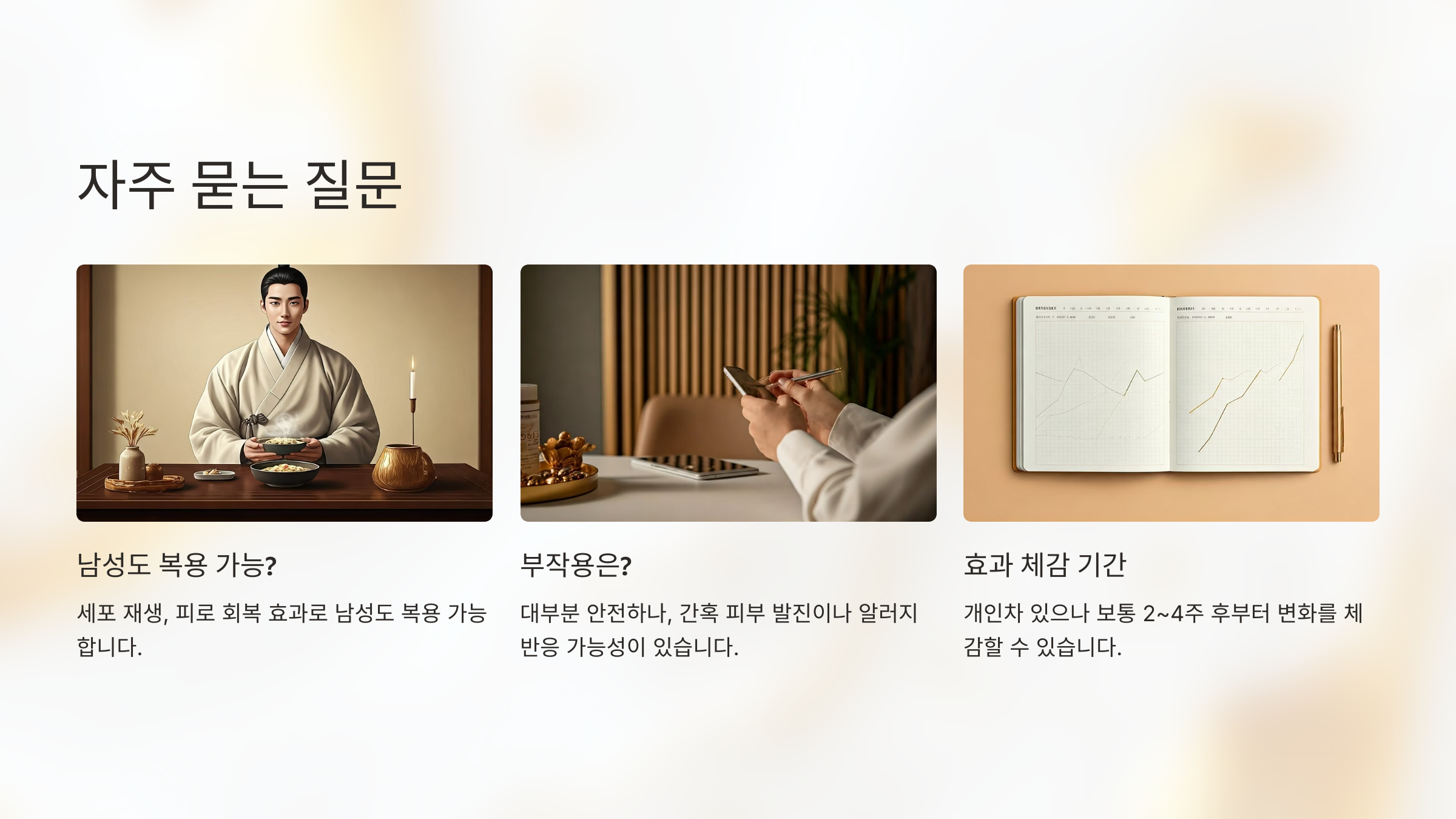 개인차가 있지만 보통 2~4주 정도 복용하면 수면 개선, 기력 회복 등의 변화를 체감할 수 있습니다.