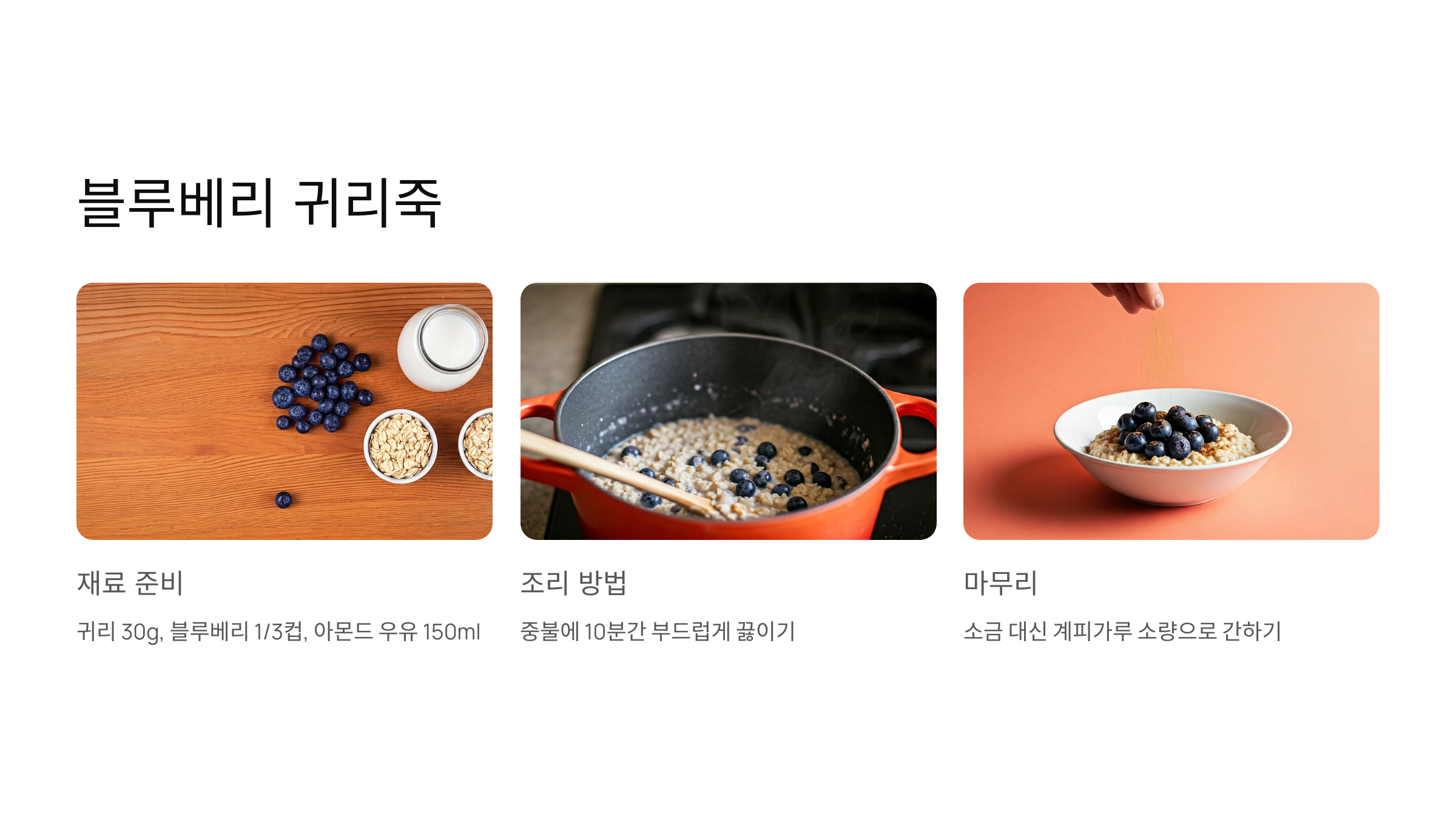 아침에 가볍고 항산화 넘치는 한 끼! 귀리와 블루베리의 조합은 면역력과 항염 효과를 동시에 줍니다.