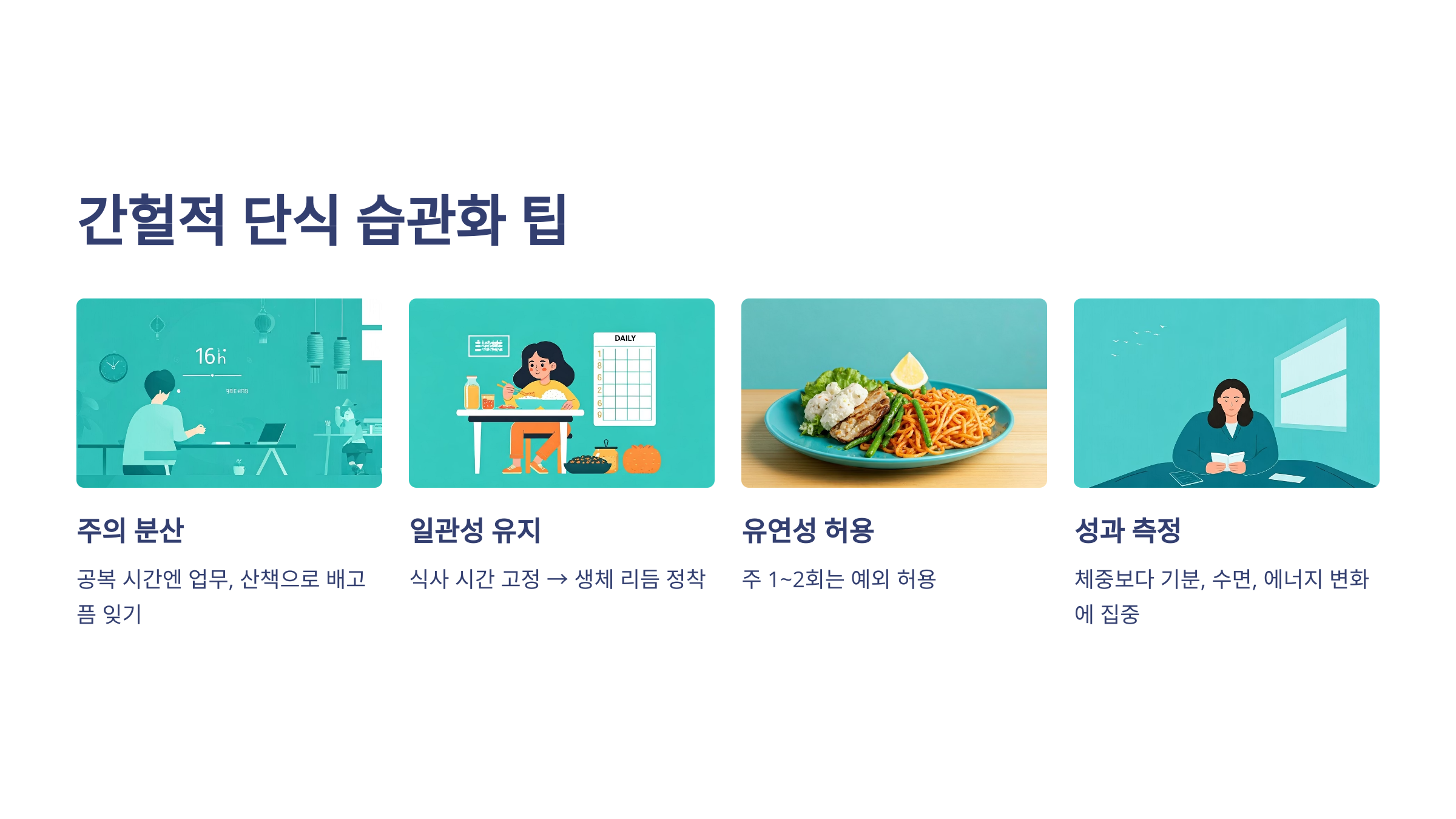 간헐적 단식을 장기적으로 지속하려면 습관으로 만드는 것이 중요합니다. 아래의 팁을 참고해보세요.