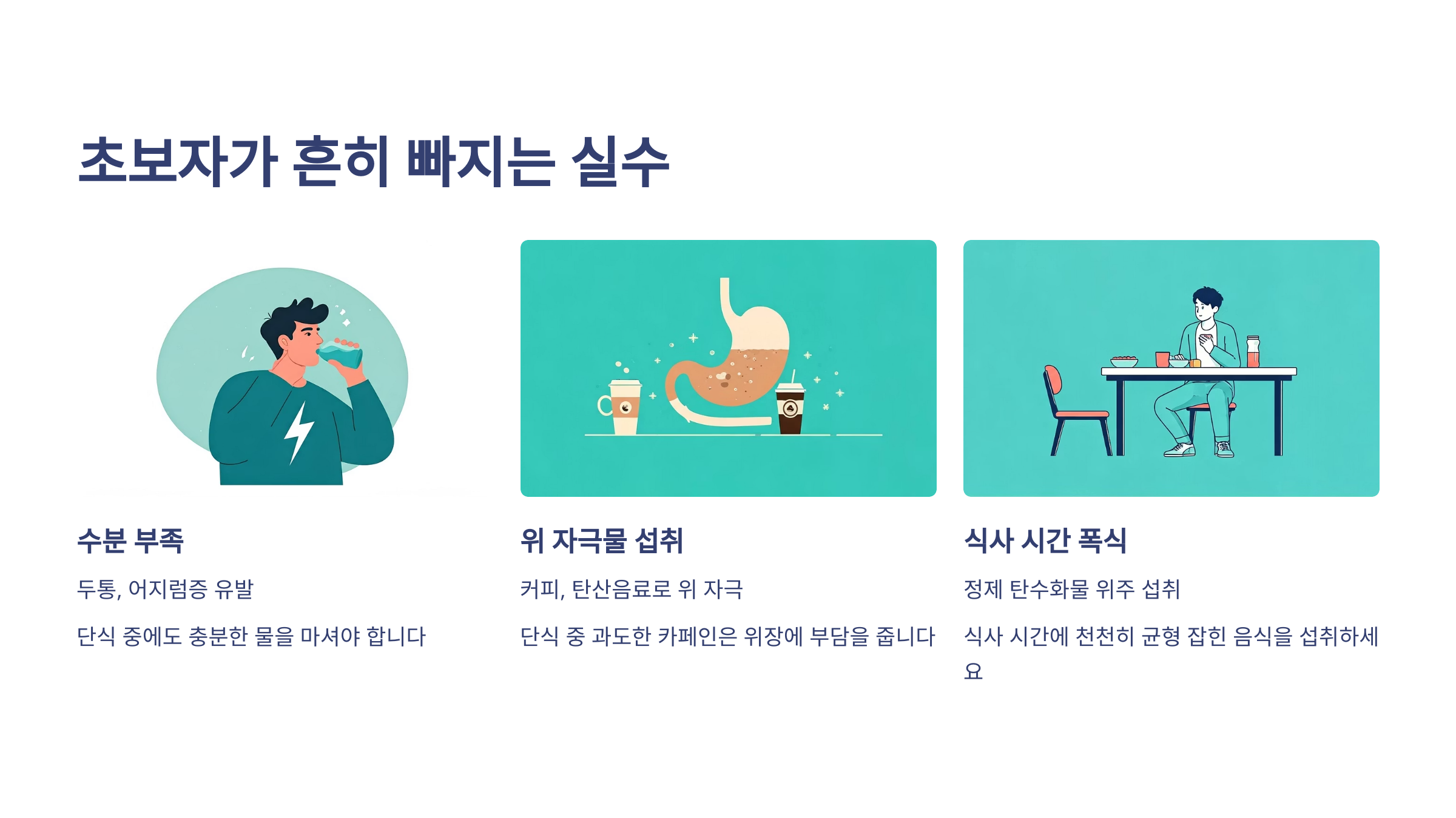 간헐적 단식을 시작할 때 다음과 같은 실수만 피해도 실패 없이 꾸준히 유지할 수 있어요.
