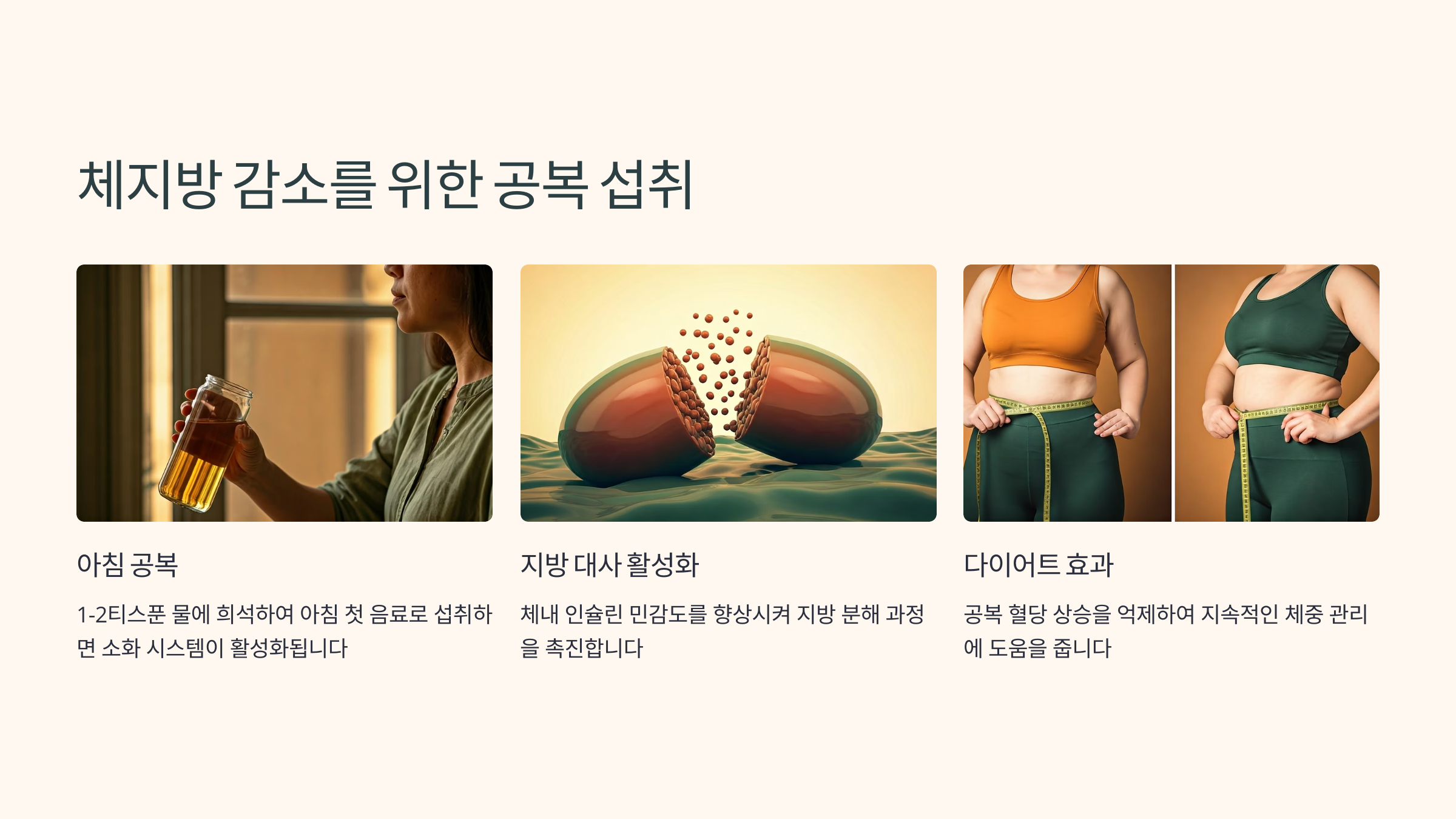 | 공복 | 1~2 티스푼 + 물 200ml | 지방 연소 촉진 |