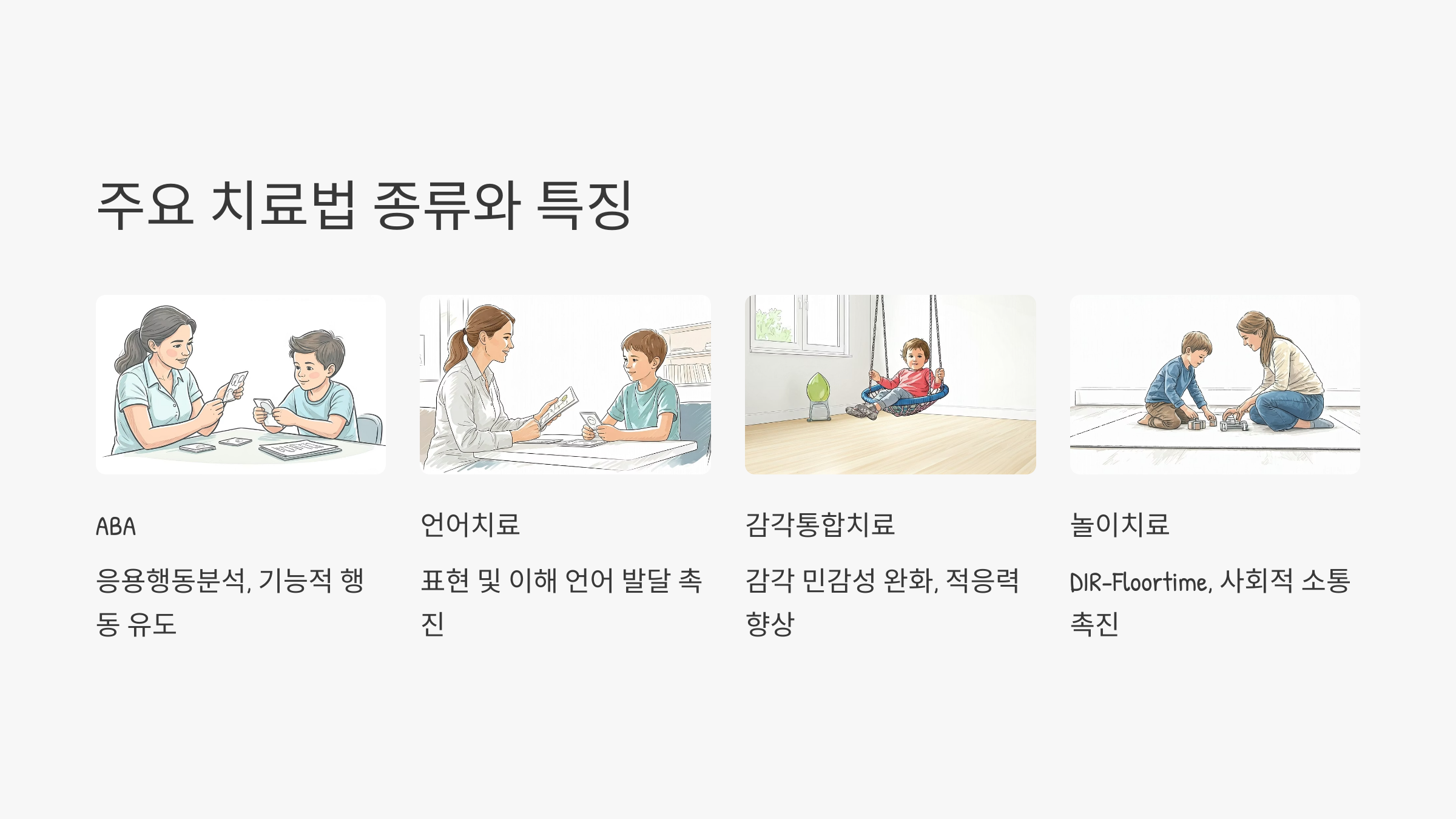 자폐 아동 치료는 한 가지 방법만으로는 부족합니다. 각 아이의 특성에 맞는 치료법을 조합하여 적용해야 하며, 주요 치료법은 다음과 같습니다.