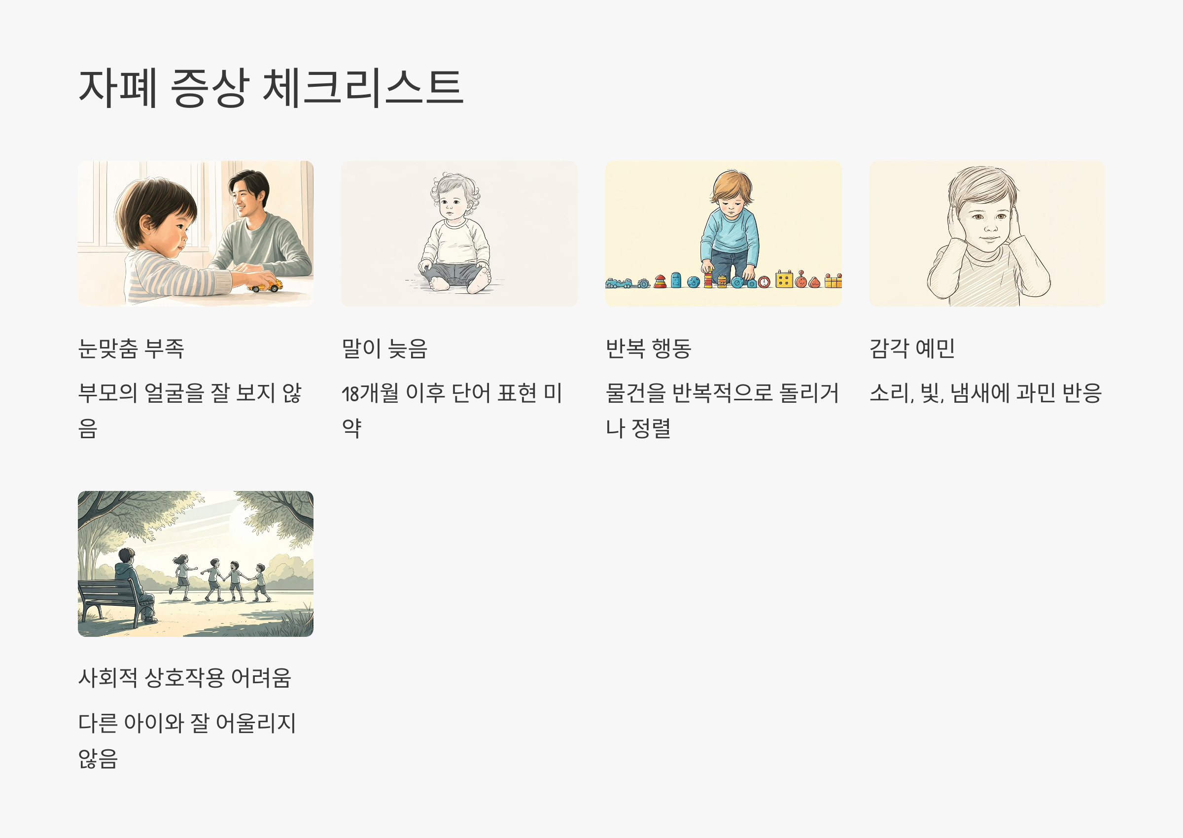 다음은 전문가들이 공통적으로 제시하는 자폐 조기 증상의 체크리스트입니다. 아래 항목 중 2~3개 이상이 해당된다면 전문가의 평가가 필요할 수 있습니다.