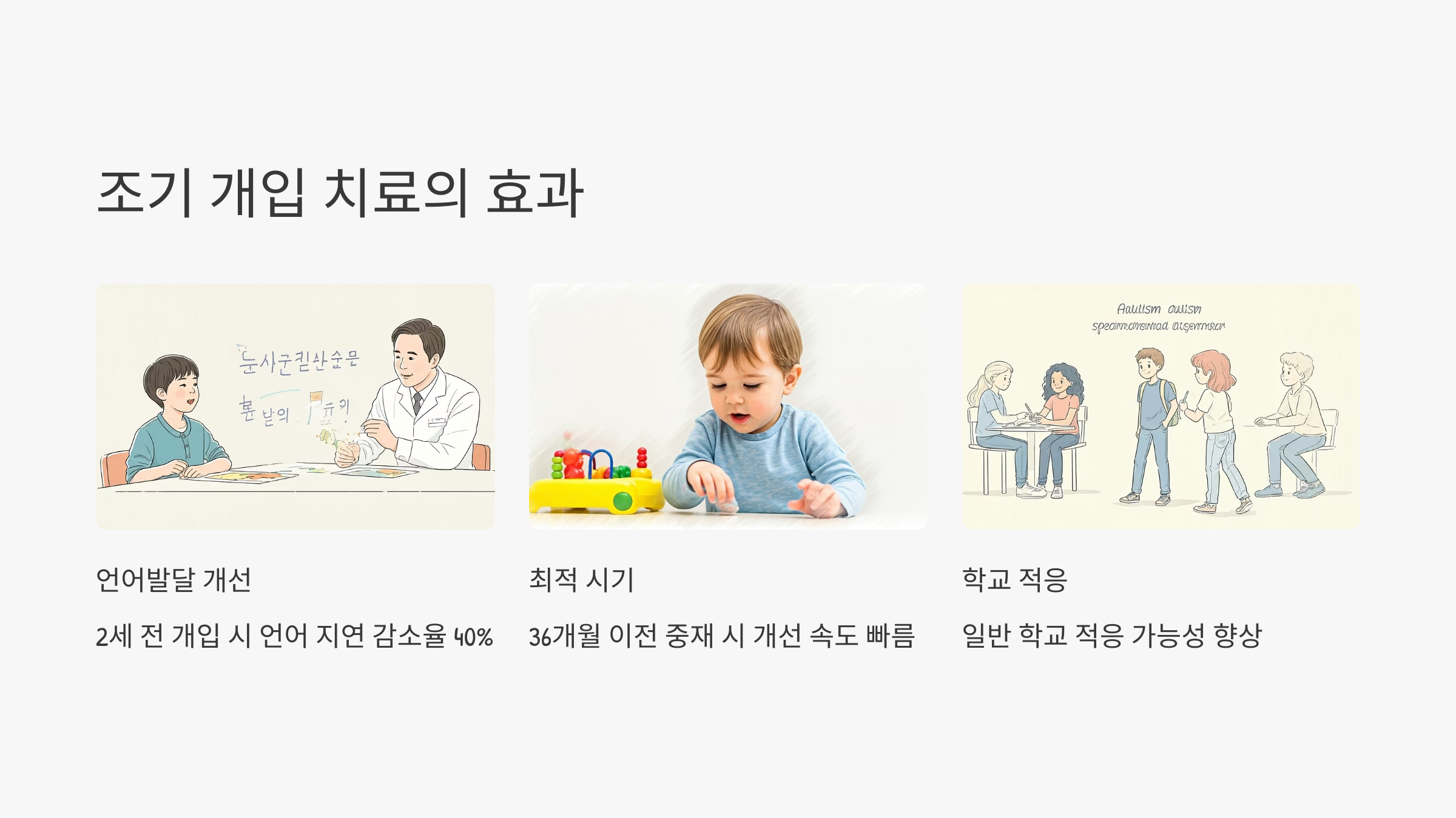 조기치료는 자폐 아동의 발달경로에 가장 큰 영향을 미치는 요소입니다. 생후 36개월 이전에 중재를 시작하면 언어, 사회성, 문제행동 개선 속도가 더 빠르고, 나중에 일반 학교 적응 가능성도 높아집니다. 최근 연구에 따르면, 2세 전 개입 시 언어발달 지연을 40% 이상 줄일 수 있다고 해요.