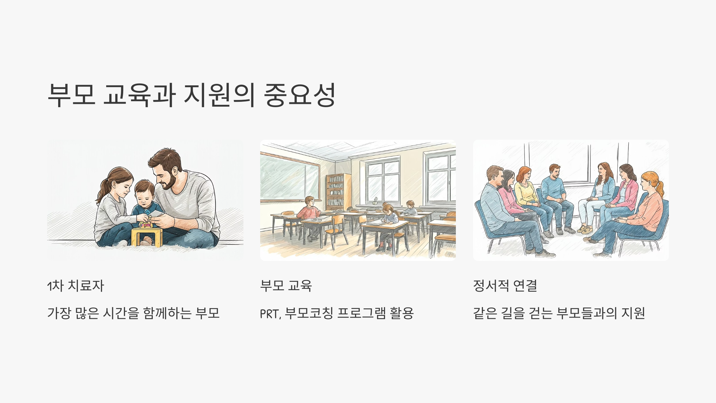부모는 아이와 가장 많은 시간을 보내는 1차 치료자입니다. 아이의 행동을 이해하고 적절히 반응하는 기술을 익히면 치료의 효과가 배가되며, 부