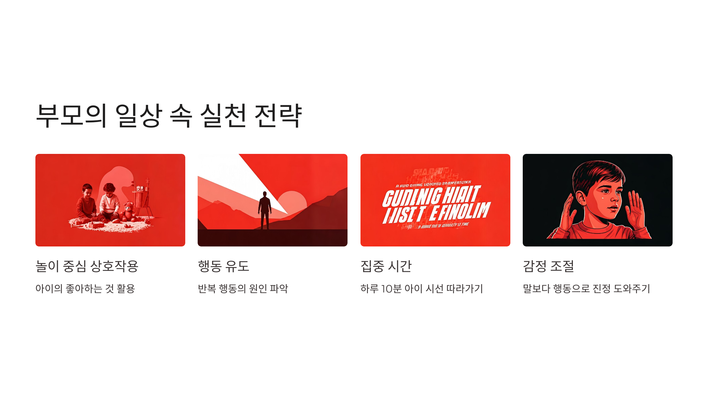 치료는 치료사만이 하는 것이 아닙니다. 부모는 일상에서 아이의 행동을 관찰하고, 치료의 연장을 실천할 수 있는 가장 중요한 존재입니다. 아래 전략들을 참고해보세요.