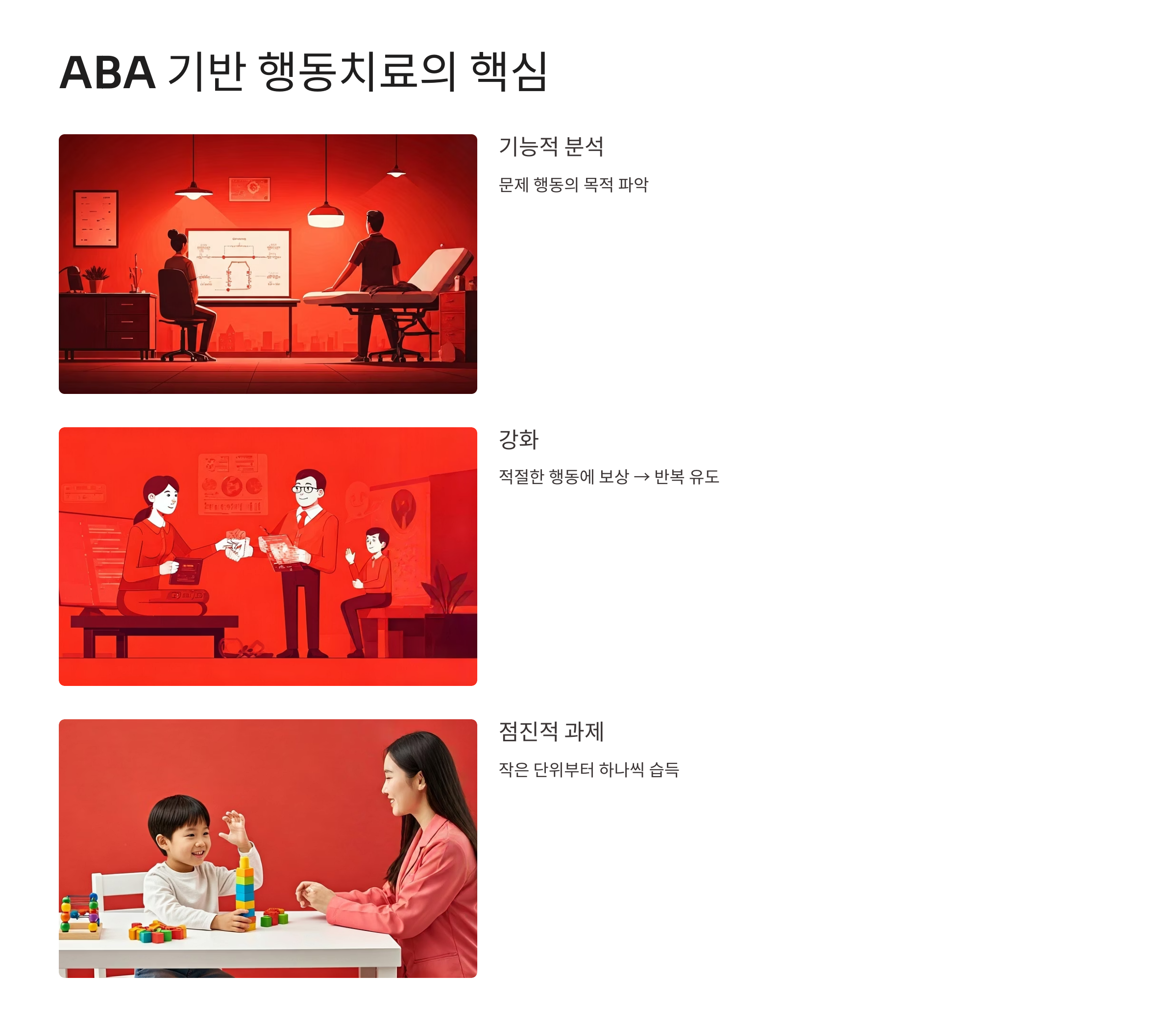 응용행동분석(ABA)은 자폐 치료에서 가장 근거 중심적인 방법으로 알려져 있어요. 문제 행동의 원인을 분석하고, 긍정적 행동을 강화하는 방식으로 아이의 기능을 향상시킵니다.