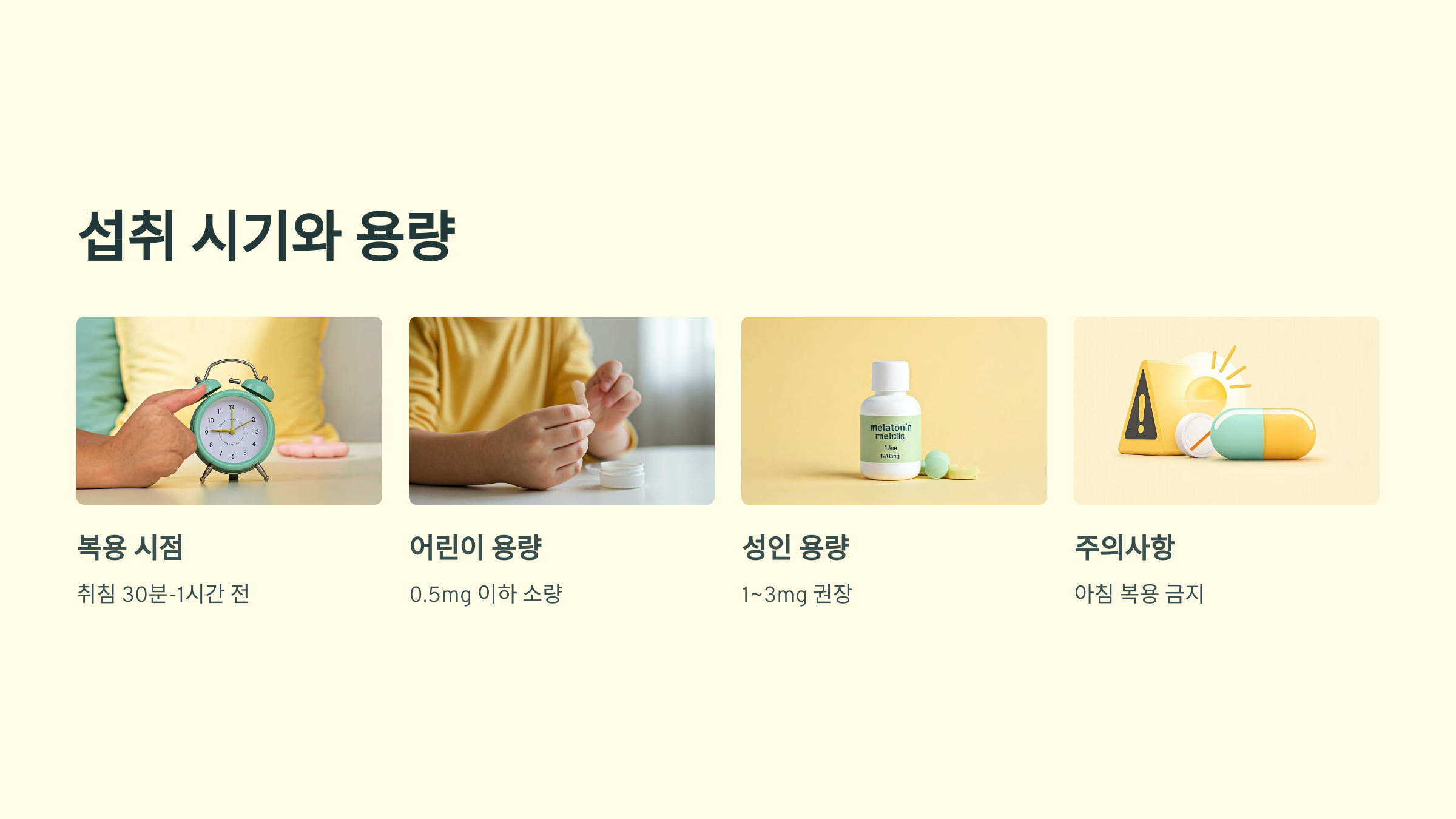 멜라토닌은 일반적으로 취침 30분~1시간 전에 복용하는 것이 가장 효과적입니다. 어린이나 자폐 아동의 경우 0.5mg 이하 소량으로 시작하며, 성인은 1~3mg까지 권장돼요. 장용성(지속 방출형) 제품은 수면 유지에 도움이 됩니다.