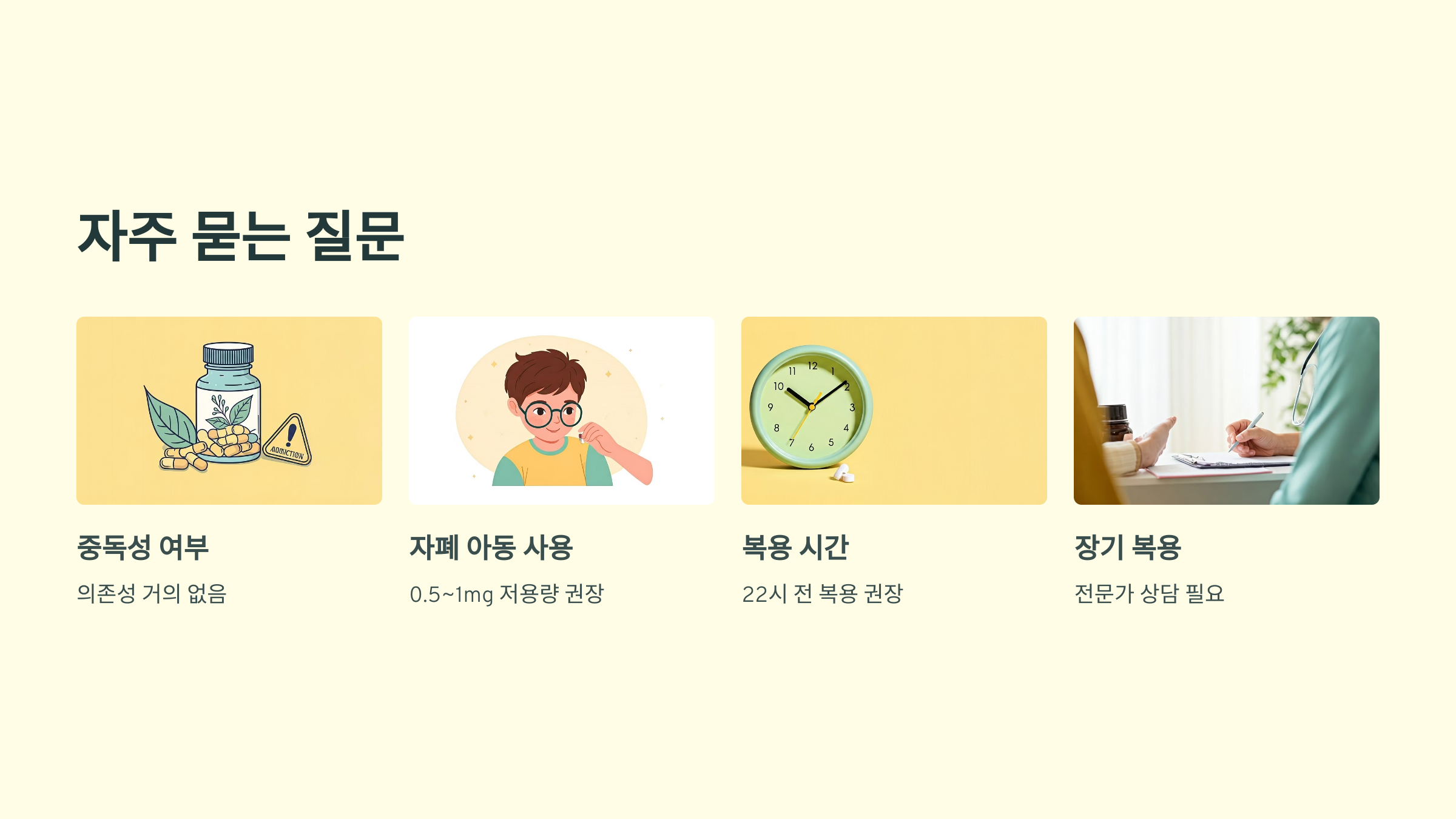 일시적 수면장애 개선에는 매일 복용 가능하지만, 장기 복용은 전문가와 상의가 필요합니다. 생체리듬 회복이 우선입니다.