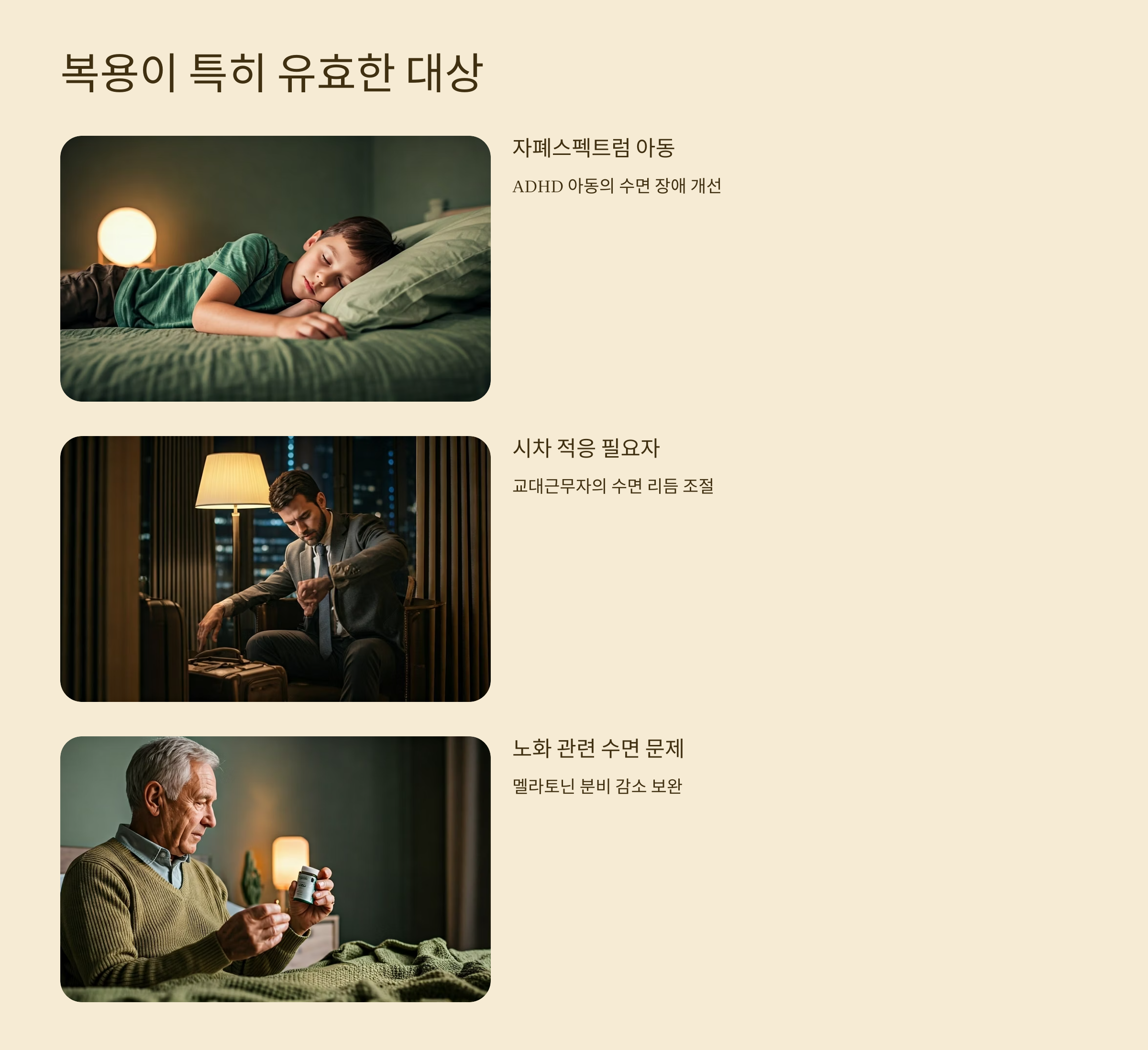 체내 수면 리듬이 무너진 경우엔 효과가 미미할 수 있어요. 이럴 땐 낮 햇빛 노출, 식사 시간 고정, 자기 전 명상 등의 수면 위생도 함께 점검해보세요.