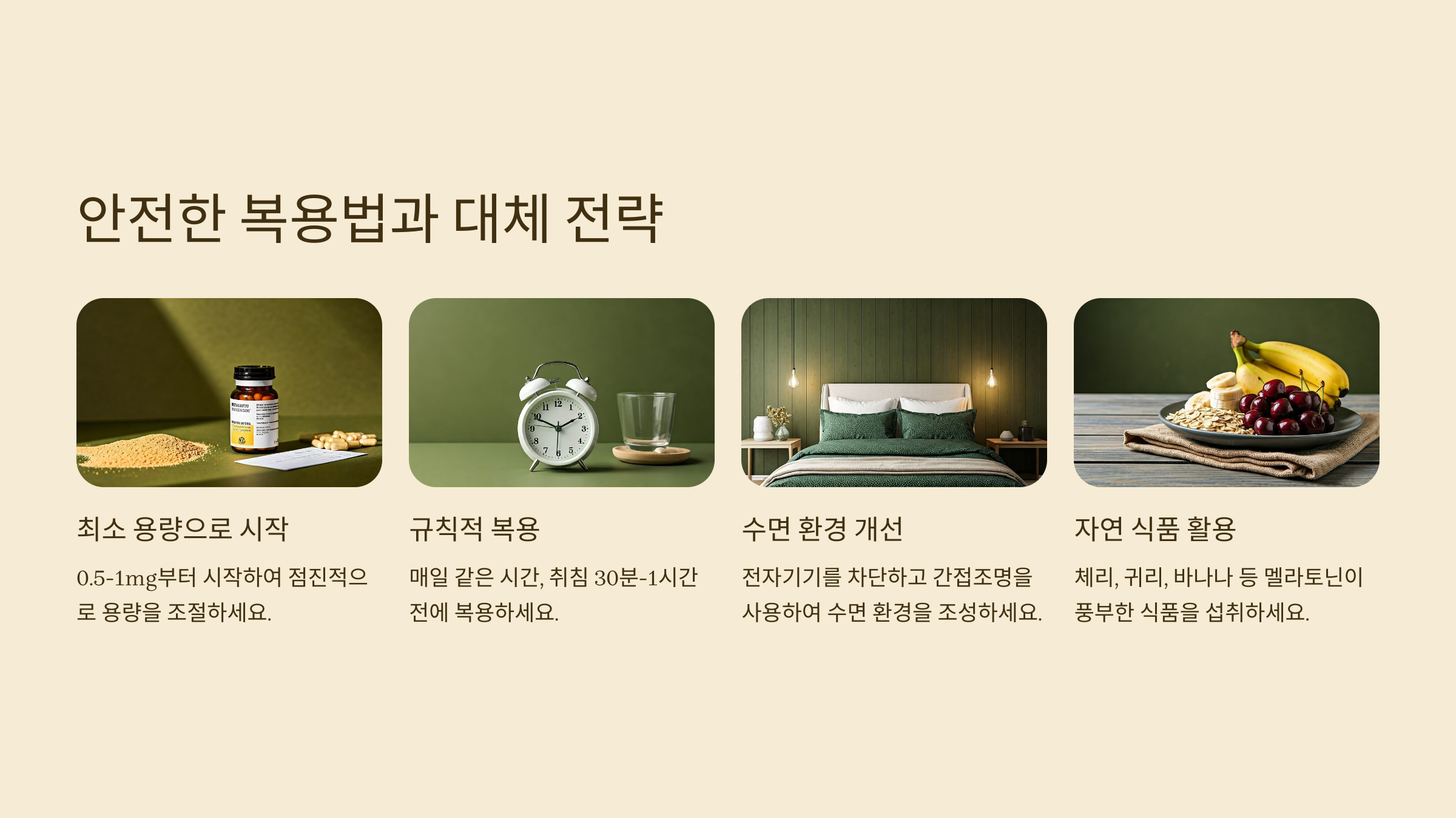 멜라토닌을 장기적으로 안전하게 복용하려면 다음과 같은 원칙을 지켜야 해요. 더불어 반드시 멜라토닌이 아니어도 수면 환경 개선을 통해 효과를 얻을 수 있습니다.