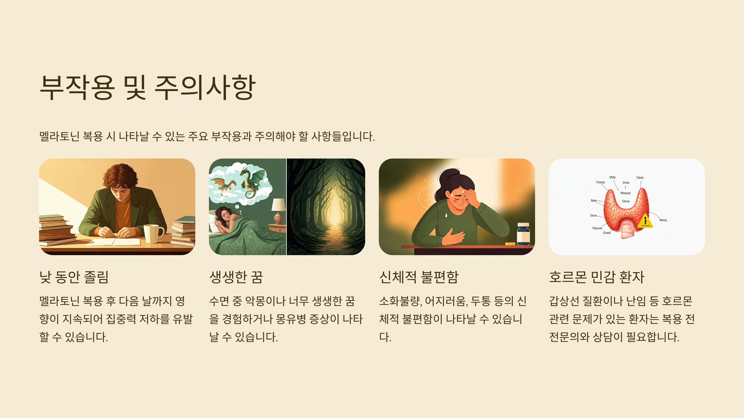 멜라토닌은 비교적 안전한 보충제지만, 일부 민감한 사람에게는 부작용이 나타날 수 있어요. 특히 과다 복용하거나 생체리듬이 맞지 않는 시간대에 복용하면 문제를 유발할 수 있습니다.