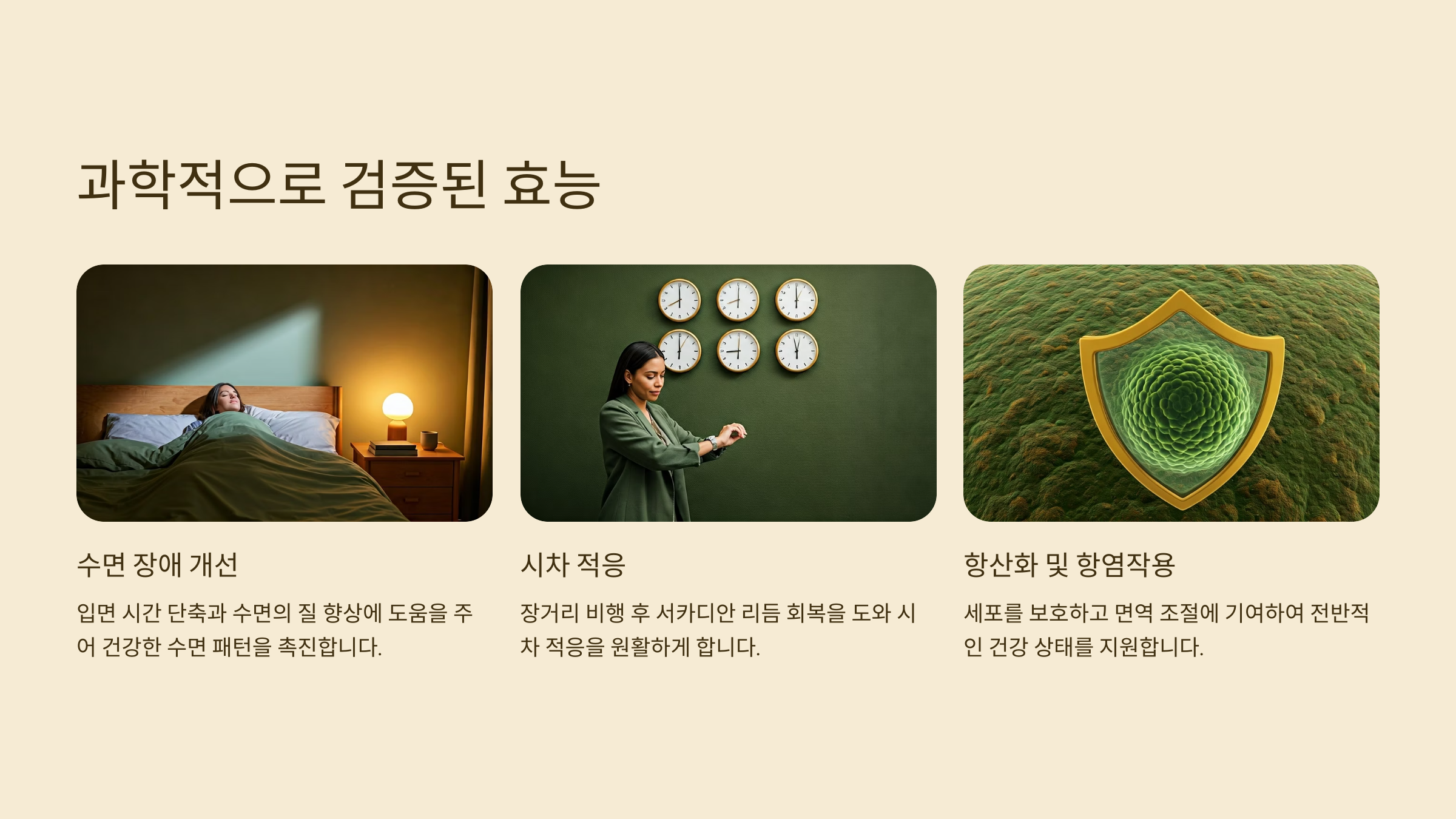 멜라토닌은 수면 유도 외에도 다양한 생리적 이점을 가지고 있어요. 다수의 임상 연구에서 멜라토닌은 다음과 같은 효능이 확인되었습니다.
