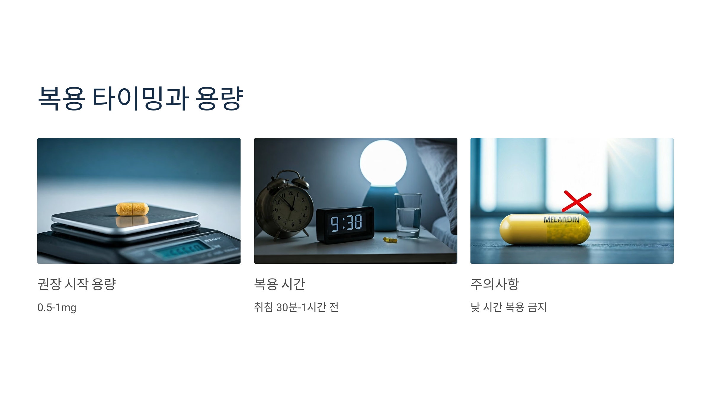 멜라토닌은 생체리듬에 직접 작용하기 때문에 ‘언제, 얼마나’ 먹는지가 매우 중요해요. 과도한 용량은 오히려 수면 패턴을 혼란시킬 수 있으며, 복용 시간은 개인의 수면 시간보다 약 1시간 이전이 적절합니다.