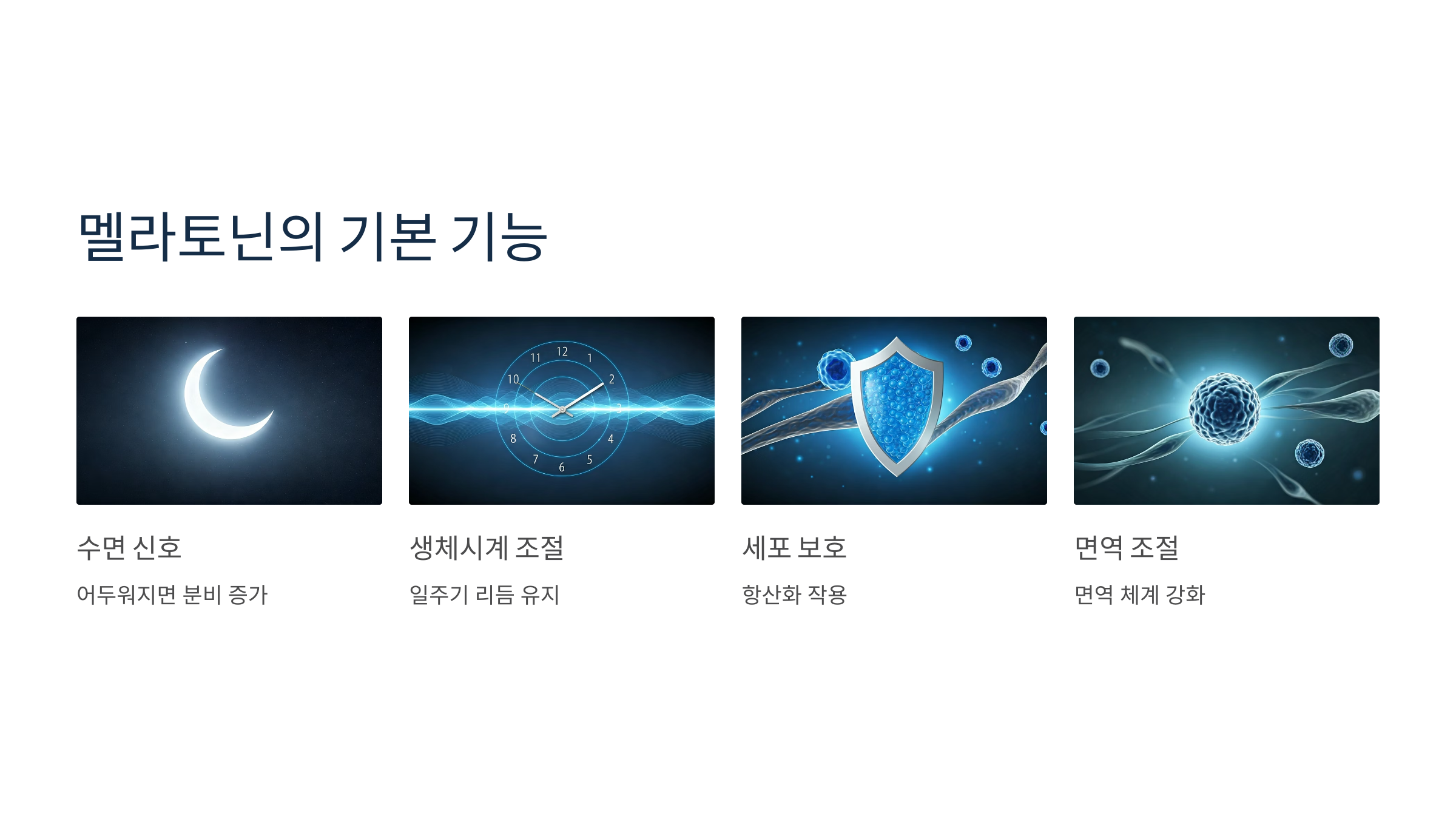 멜라토닌은 뇌의 송과선에서 만들어지는 생체 호르몬으로, 빛이 어두워지면 분비가 증가해 ‘잠 잘 시간’이라는 신호를 보내는 역할을 합니다. 하지만 단순한 수면 호르몬이 아니라 생체시계 조절, 면역 조절, 세포 보호 기능까지 갖춘 다기능 물질이에요.