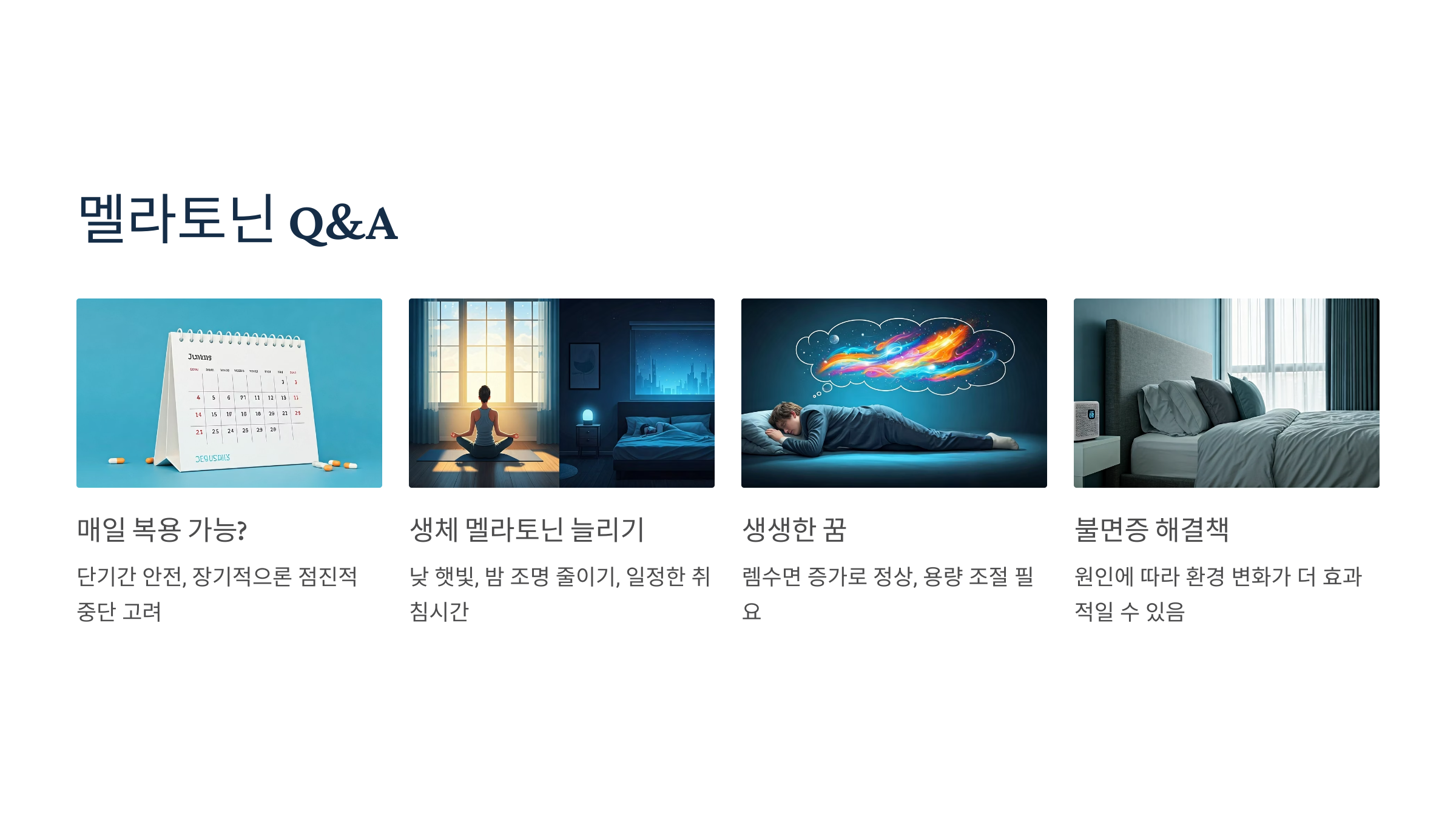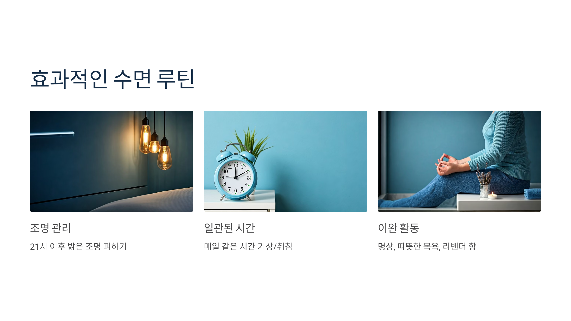 멜라토닌은 ‘마법의 수면제’가 아니에요. 진짜 효과를 보려면 생활 루틴도 함께 바뀌어야 합니다. 밤에 어두운 환경을 만들고, 낮엔 햇빛을 쬐며, 일관된 취침 시간을 유지하는 것이 핵심입니다.