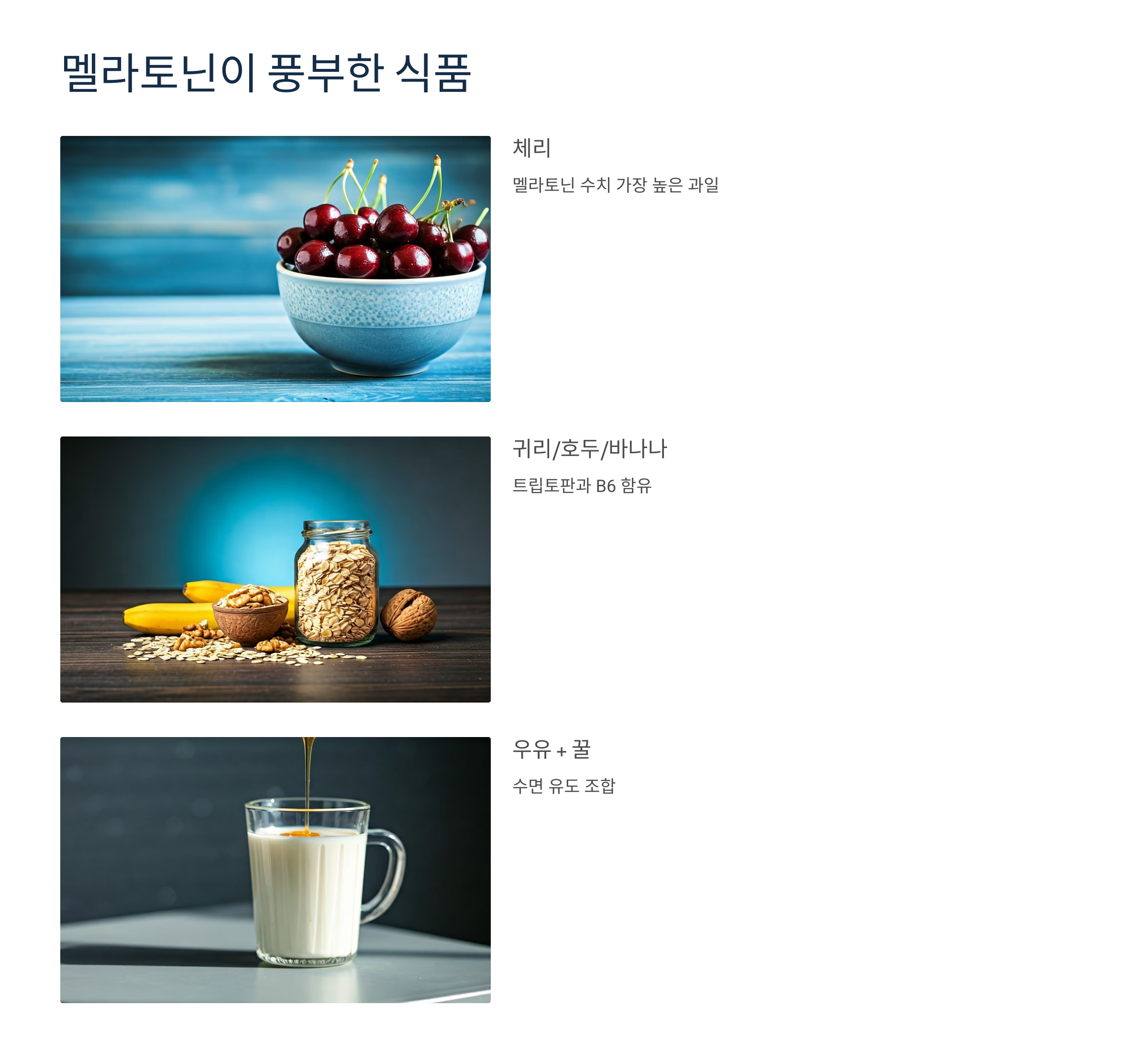 멜라토닌은 음식에서도 소량 얻을 수 있습니다. 체리, 귀리, 바나나, 견과류는 멜라토닌 및 그 전구체인 트립토판이 풍부한 대표적인 식품이에요. 다만 수면장애가 심한 경우 보충제로 도움받는 것이 현실적입니다.